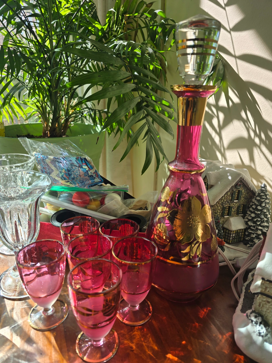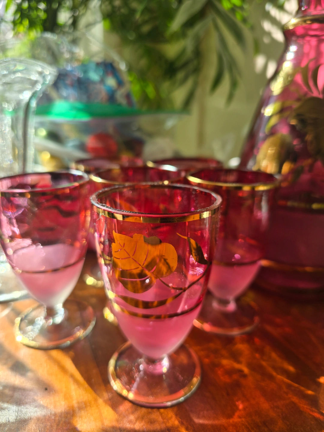 Beautiful vintage decanter and six shot glasses. Pink glass with gold detailing. Elegant design, perfect for entertaining.