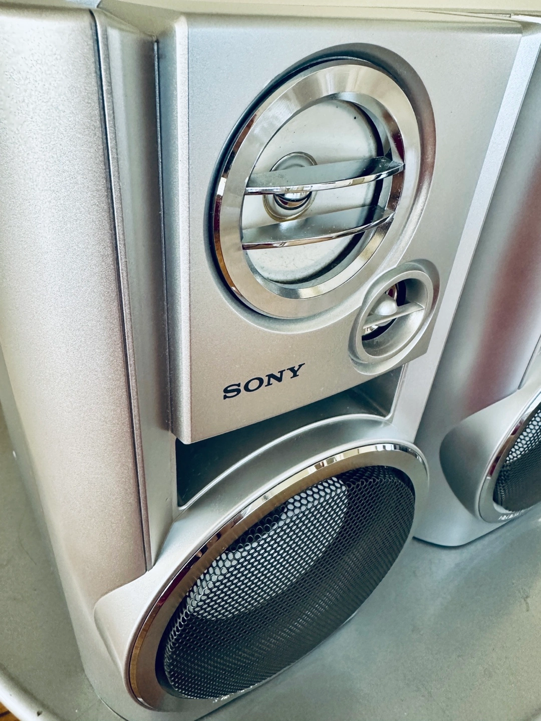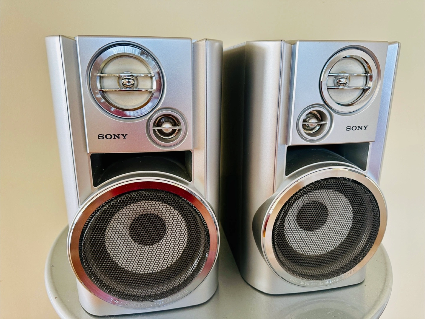 Pair of Sony stereo speakers. Silver finish. Great sound quality. 3-way bass reflex speaker system