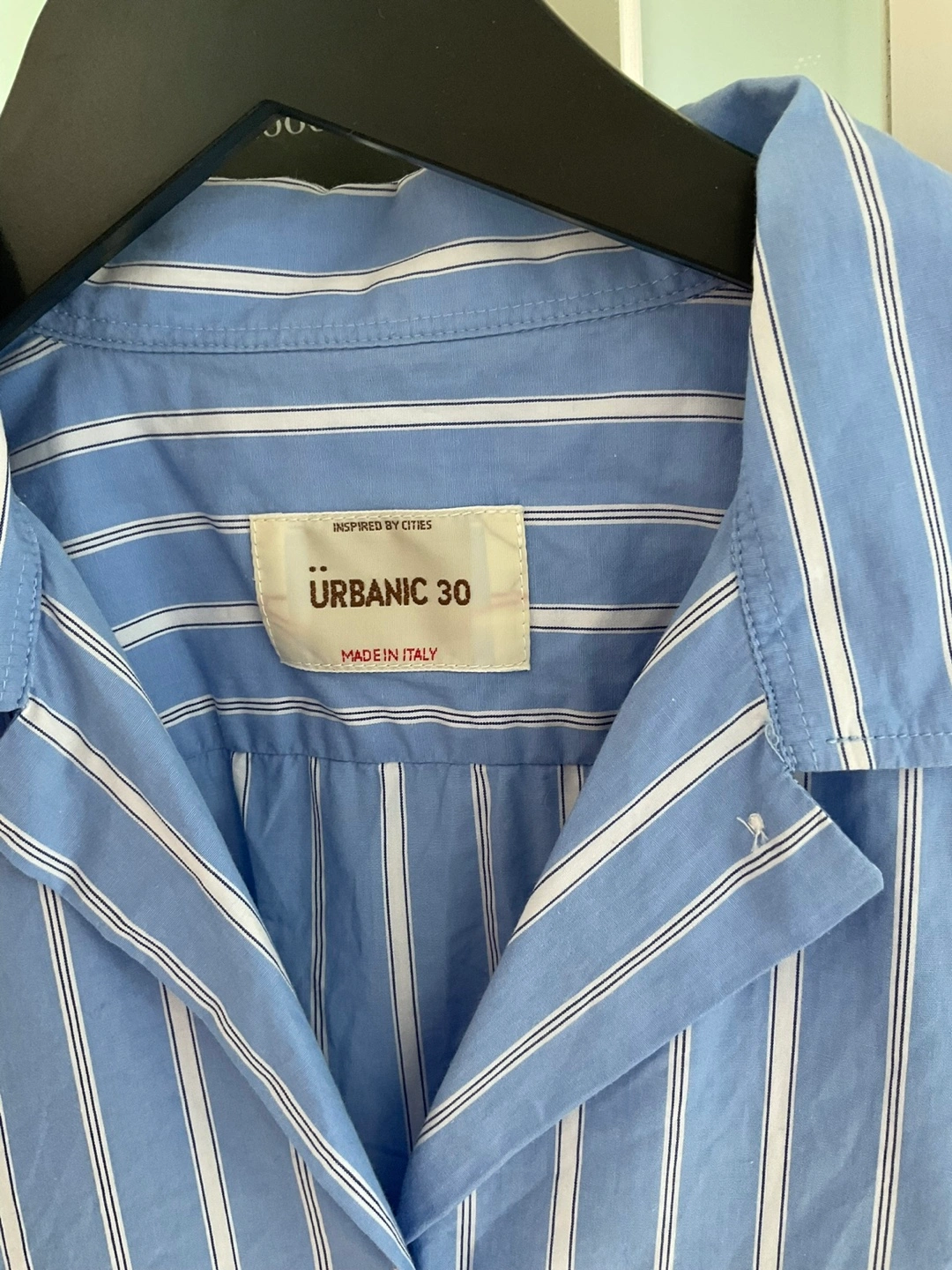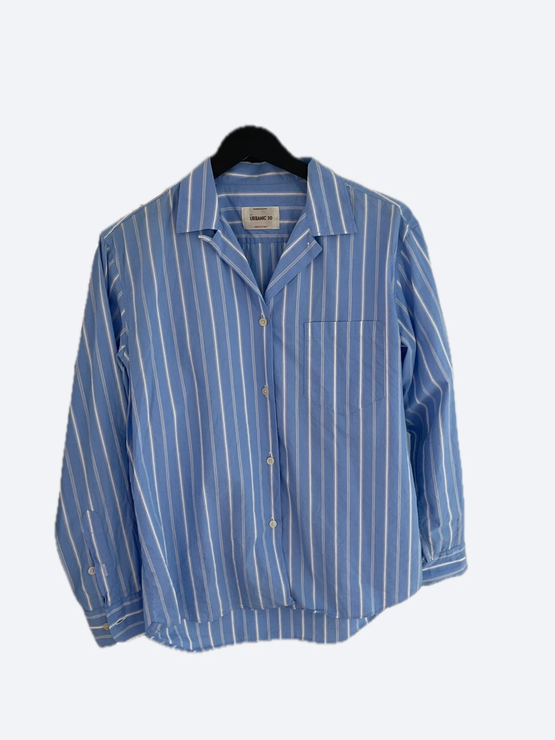 Long-sleeved button-down shirt. Blue and white vertical stripes. Relaxed fit. Made in Italy.