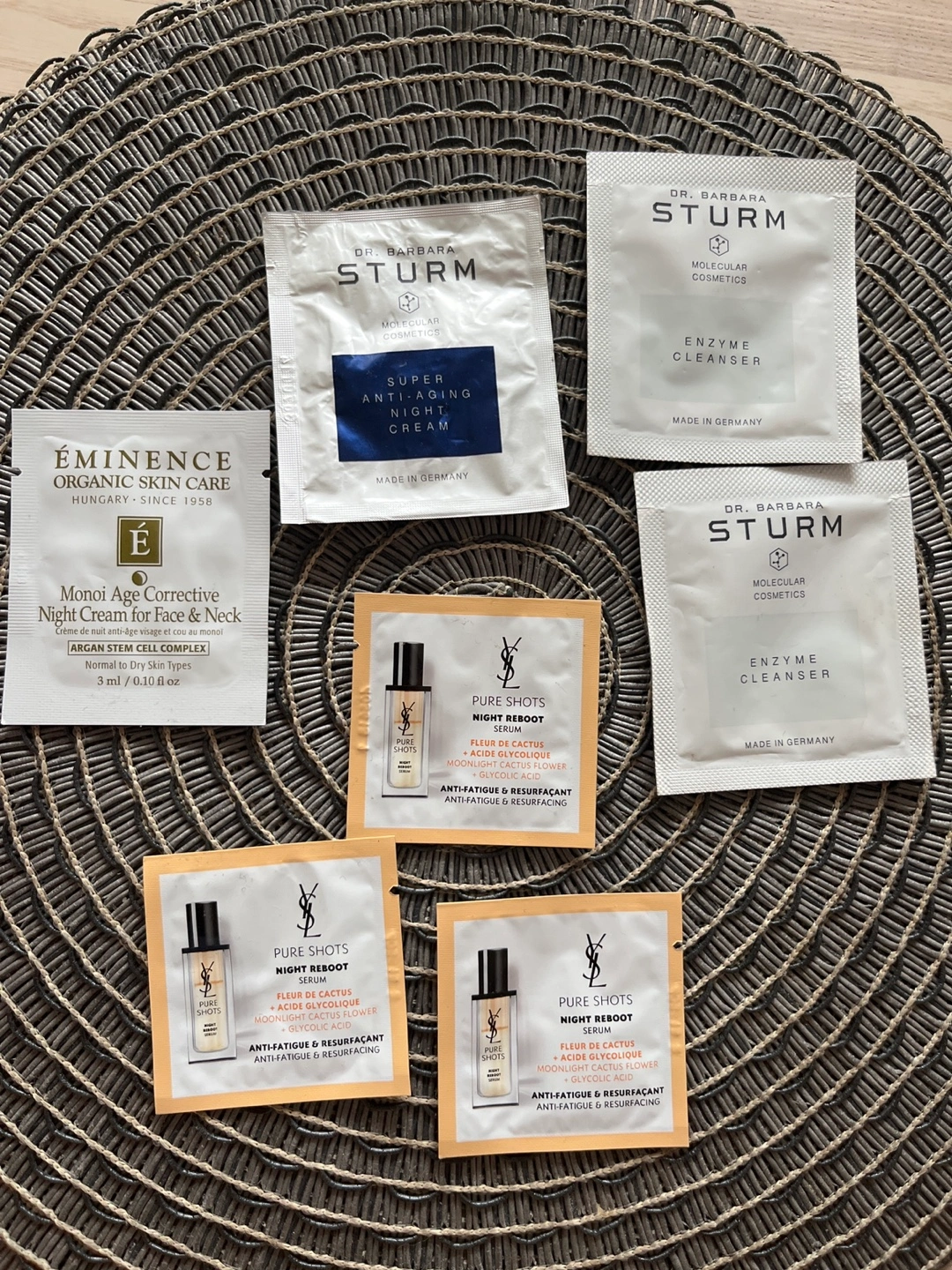 Set of various skincare sample sachets. Unopened. Includes Dr. Barbara Sturm enzyme cleanser and night cream, Eminence Monoi Age Corrective Night Cream, and Yves Saint Laurent Pure Shots Night Reboot serum.