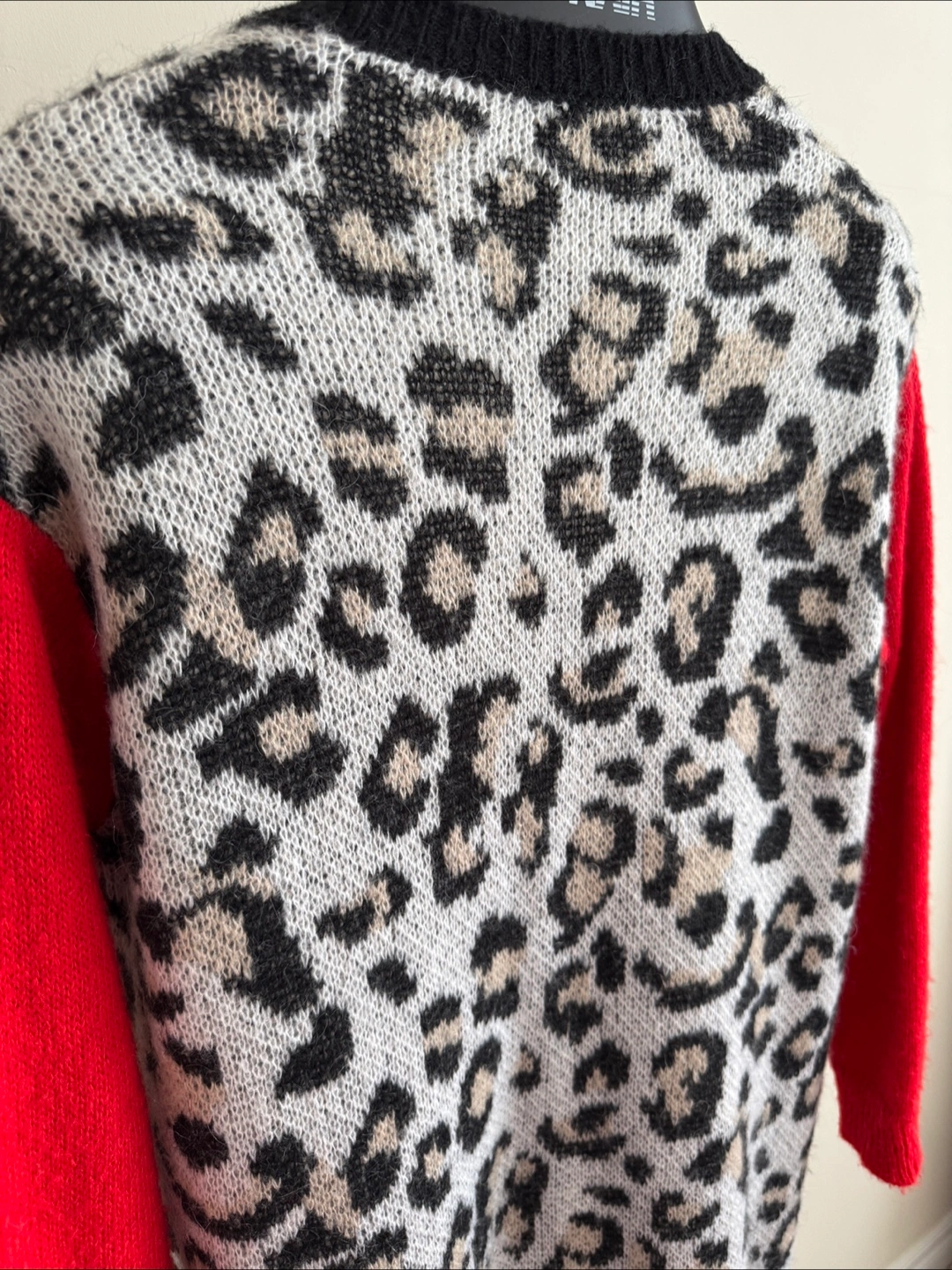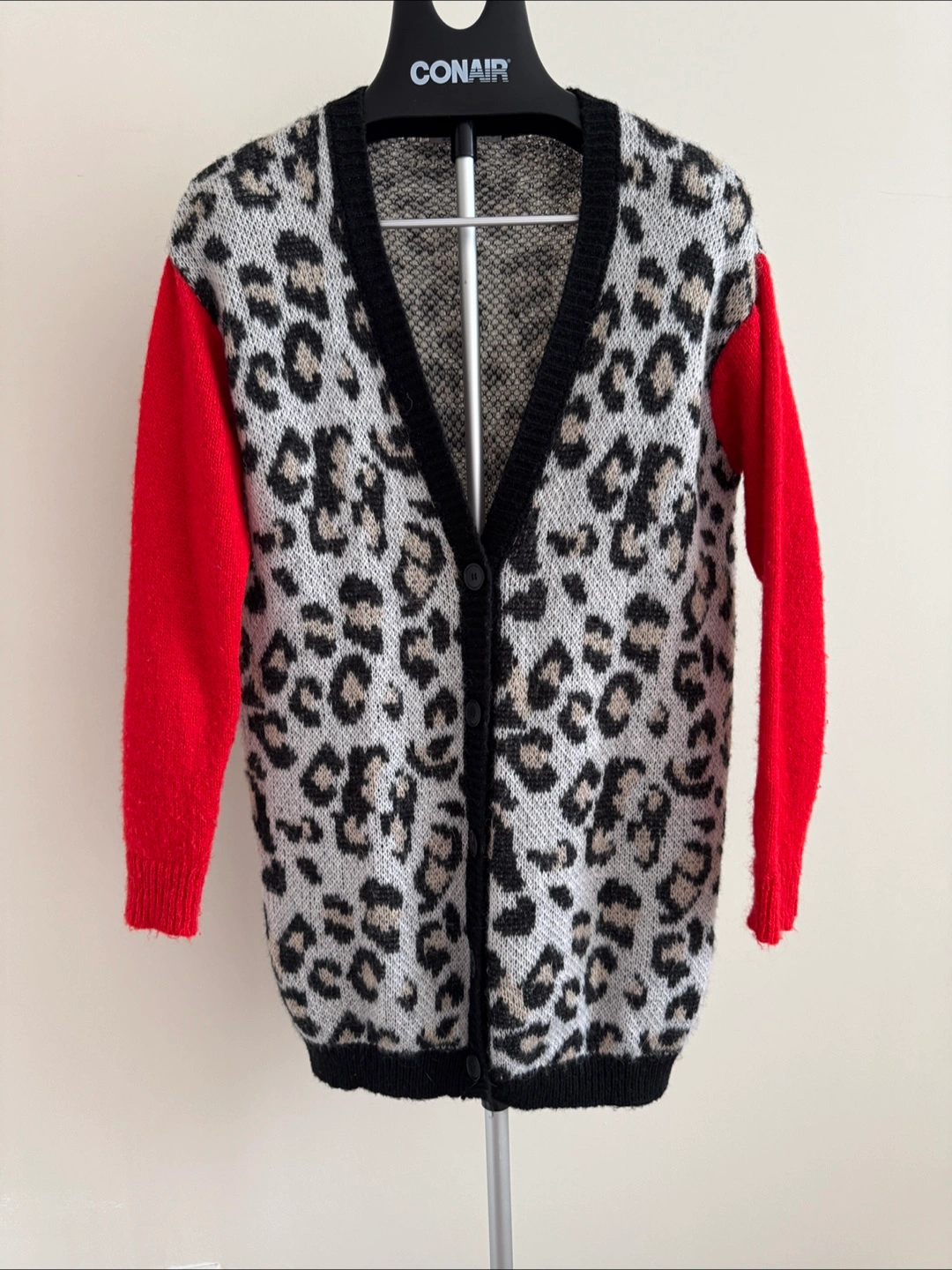 Cozy knit cardigan. Features a leopard print design and red sleeves. Button closure. Great for fall and winter. Length from shoulder: 32” Relax fit.