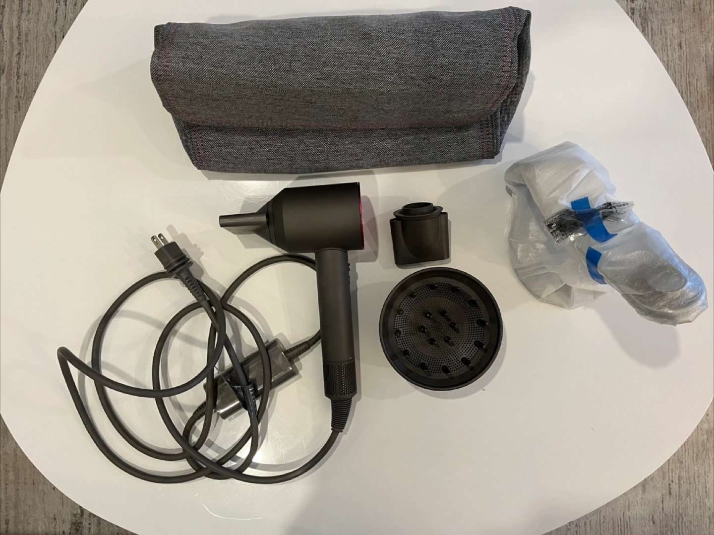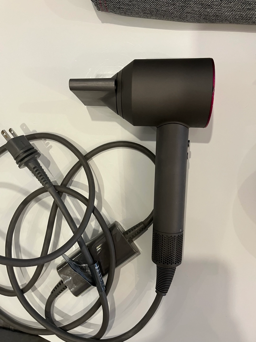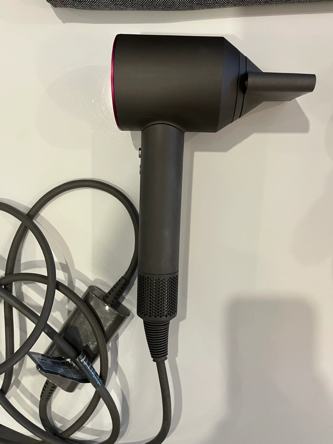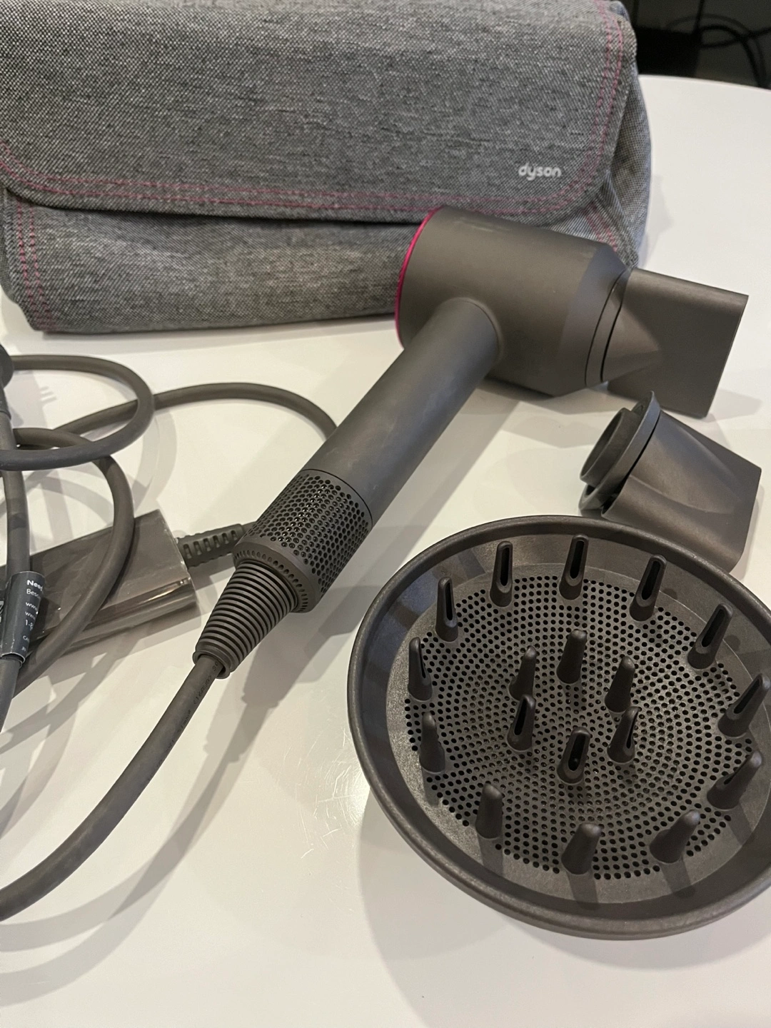 Dyson hair dryer, Iron/Fuchsia colour. Includes attachments, carrying case, and stand. Gently used.