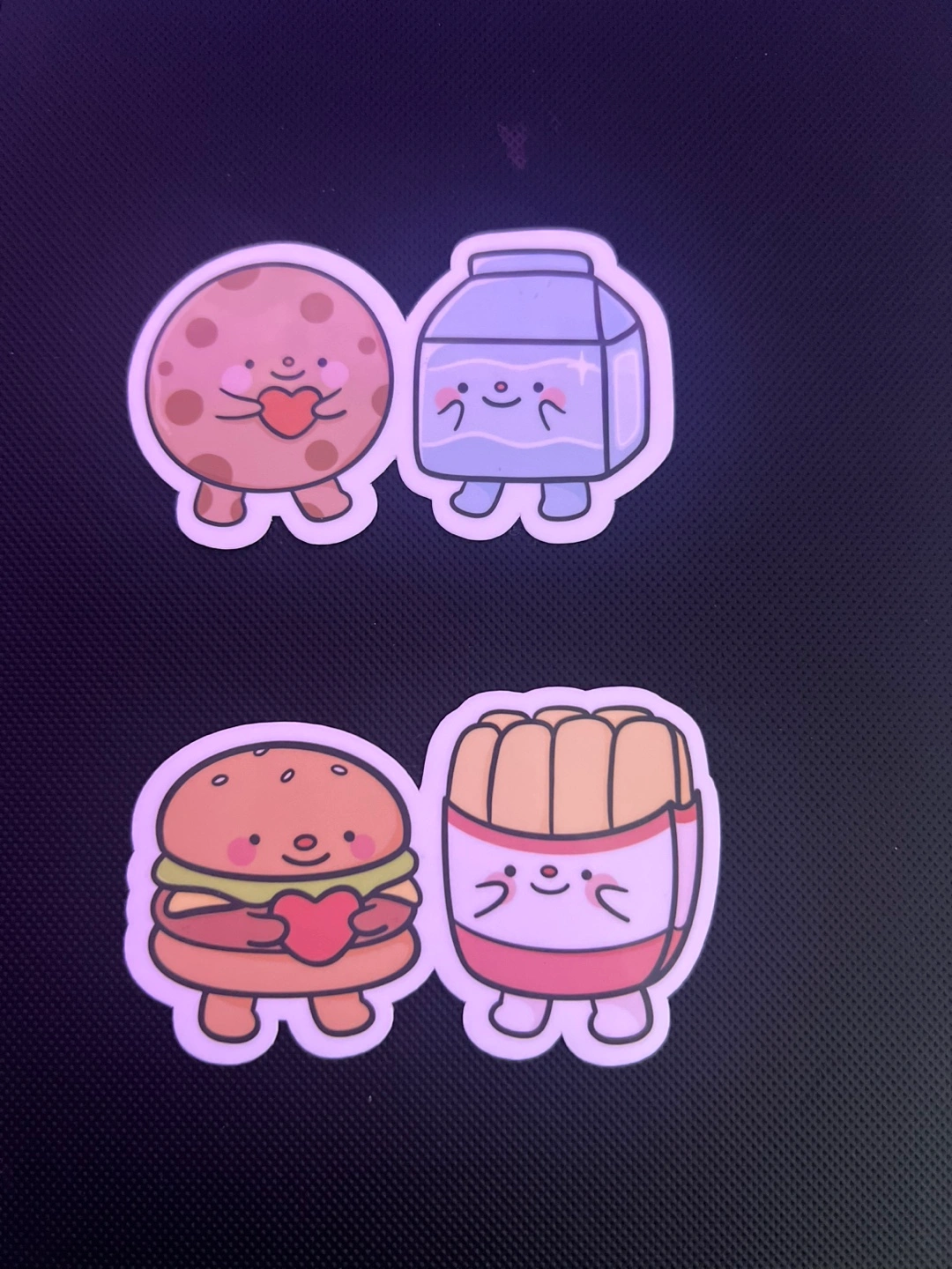 89Set of four adorable food stickers. Features a cookie, milk carton, hamburger, and fries. Each character holds a heart. Perfect for laptops, water bottles, or journals.