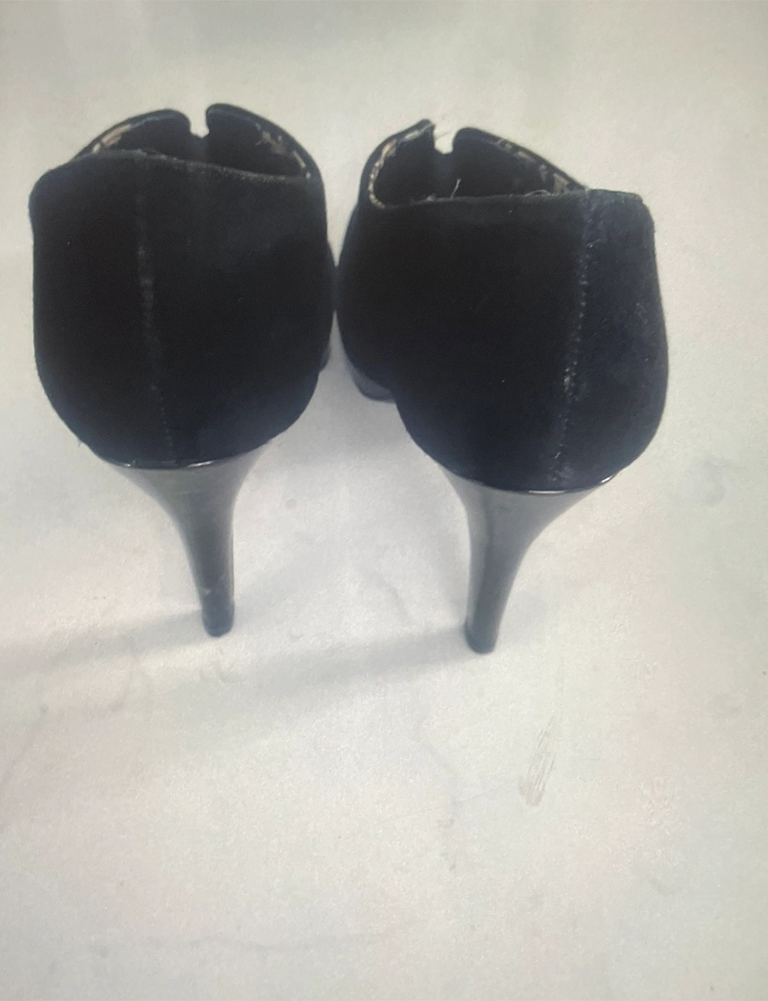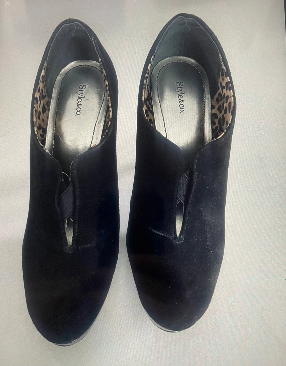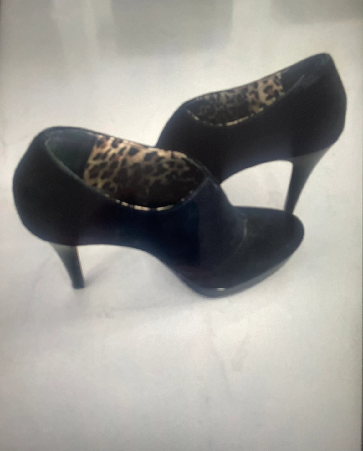28Elegant black suede ankle boots. High stiletto heels. Leopard print insole. Excellent for special occasions. Size 7