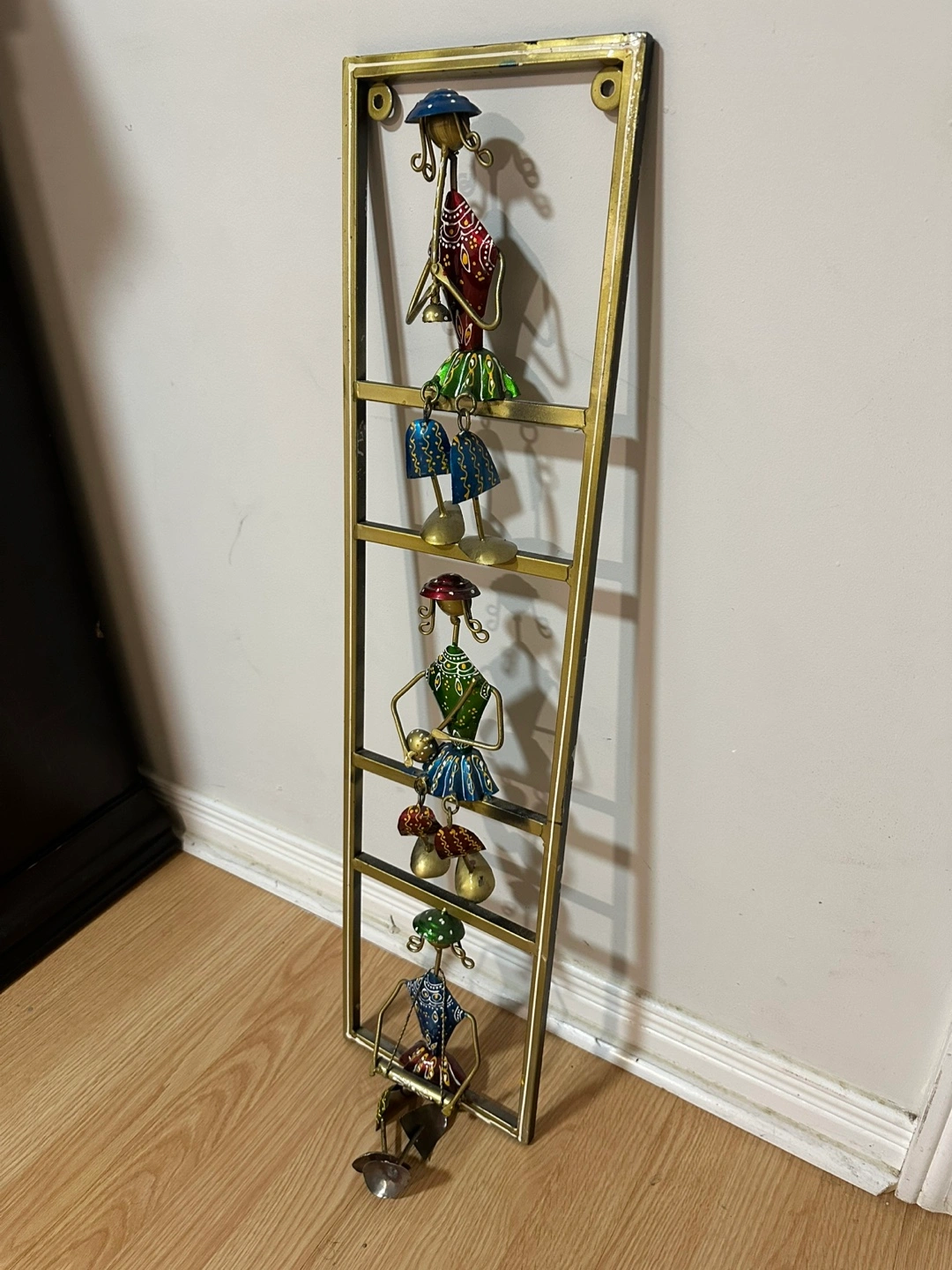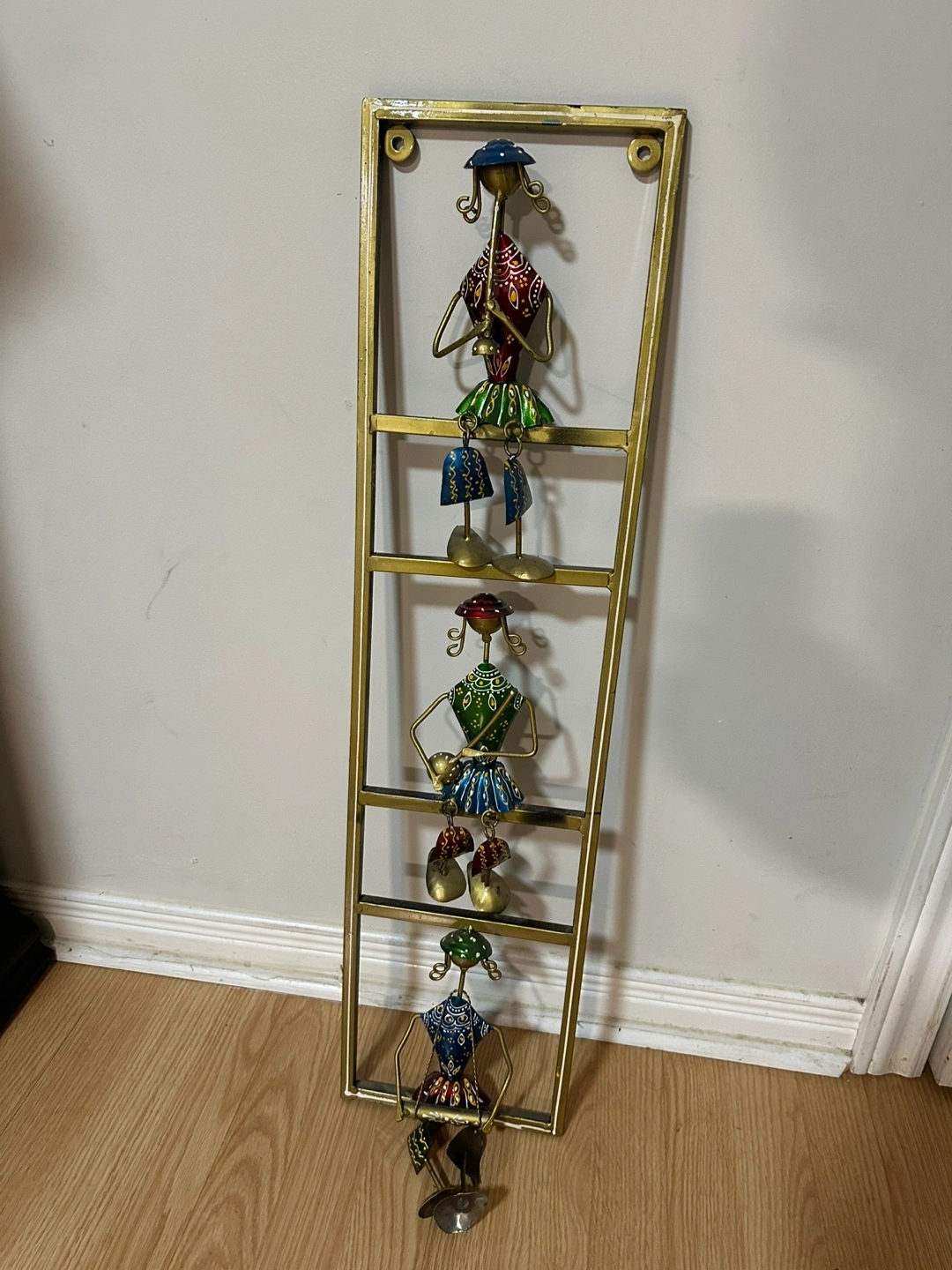 Unique wall décor. Four colourful figurines attached to a gold metal frame. Hand-painted details. Adds character to any room.