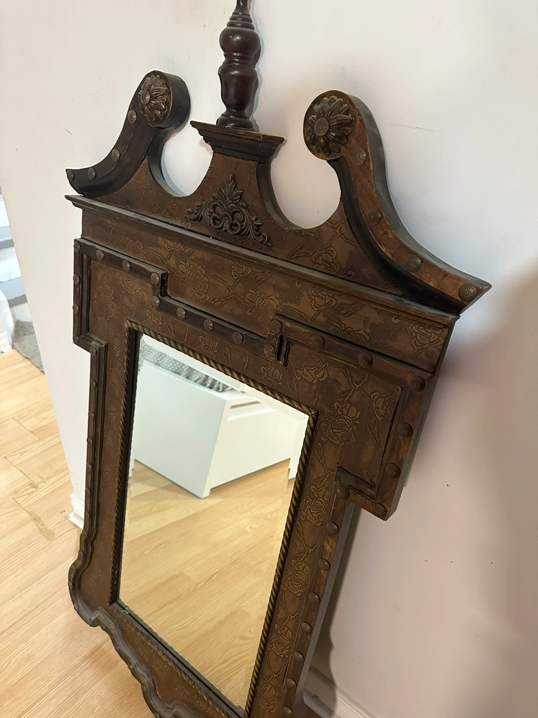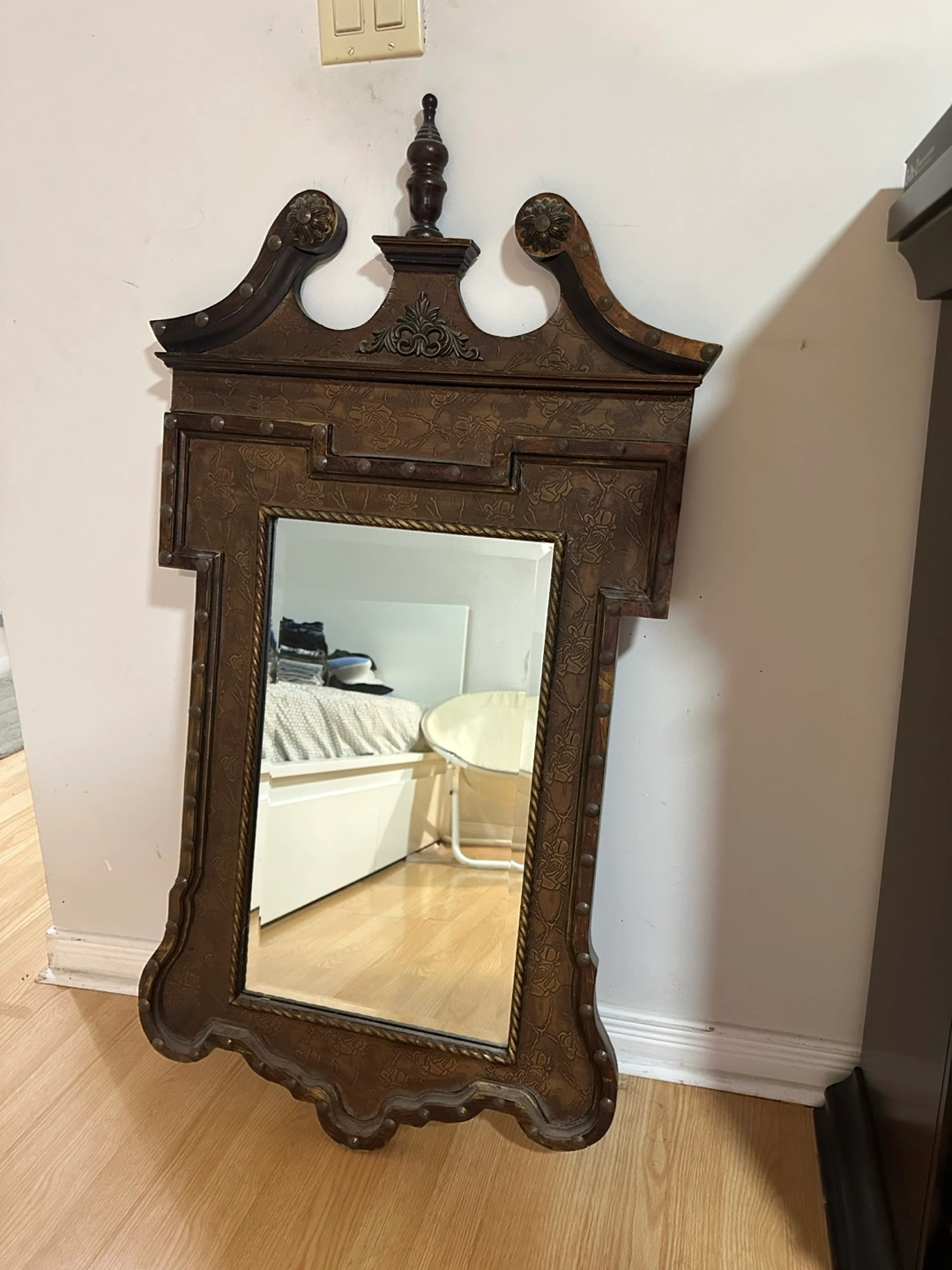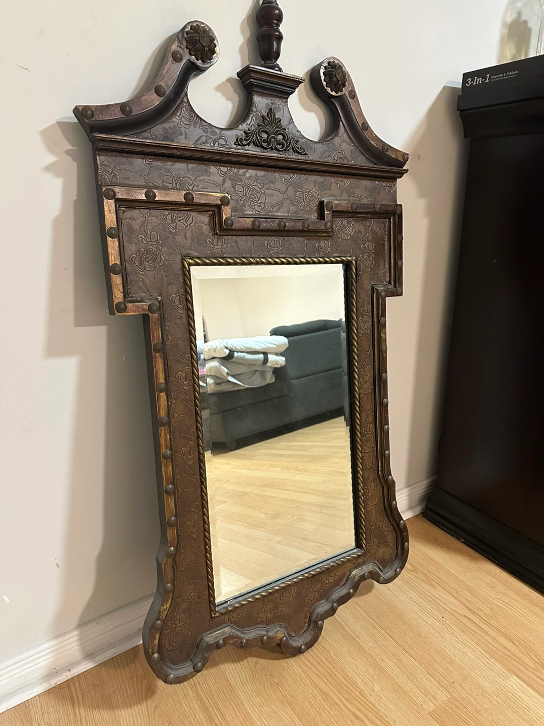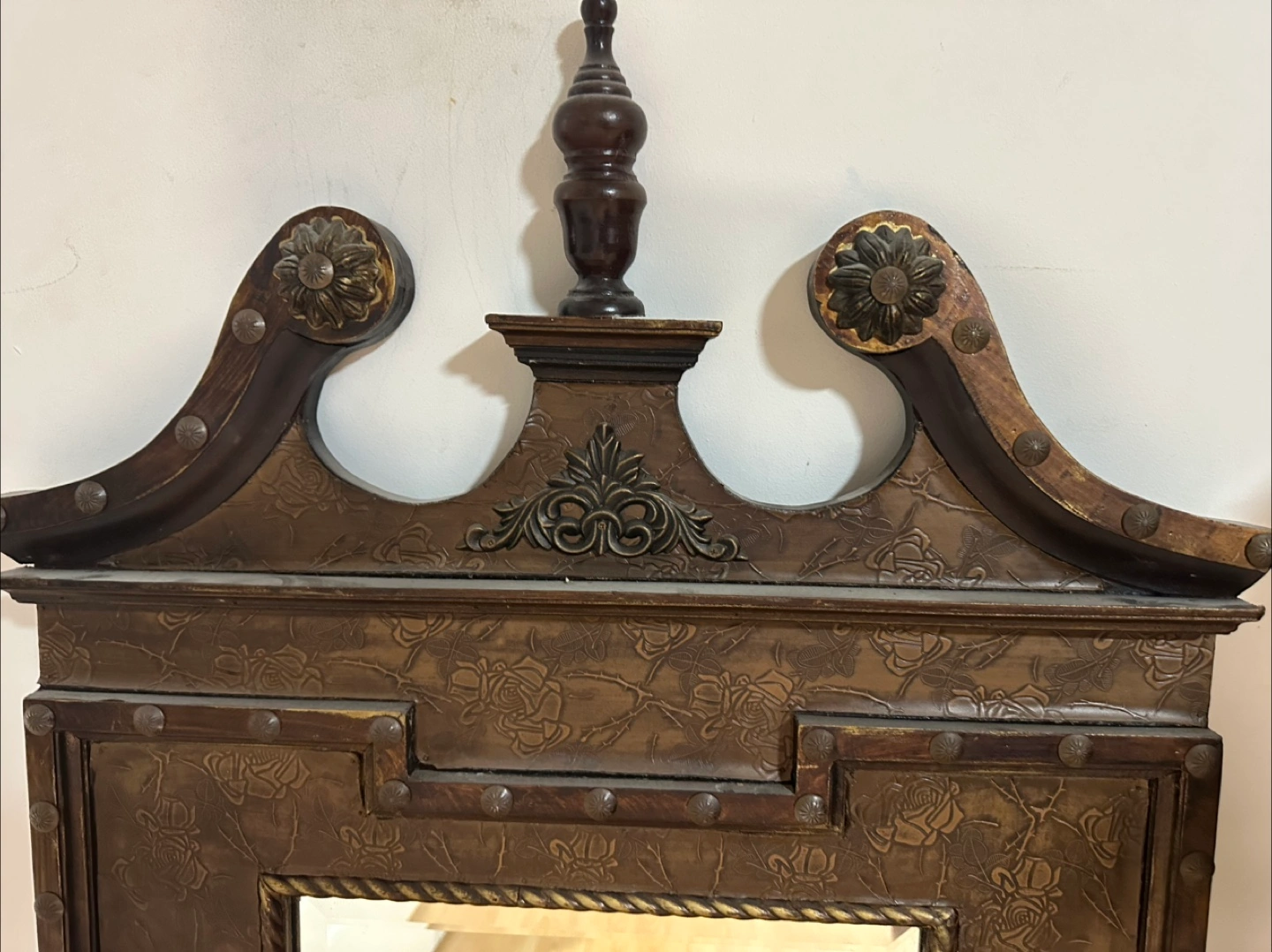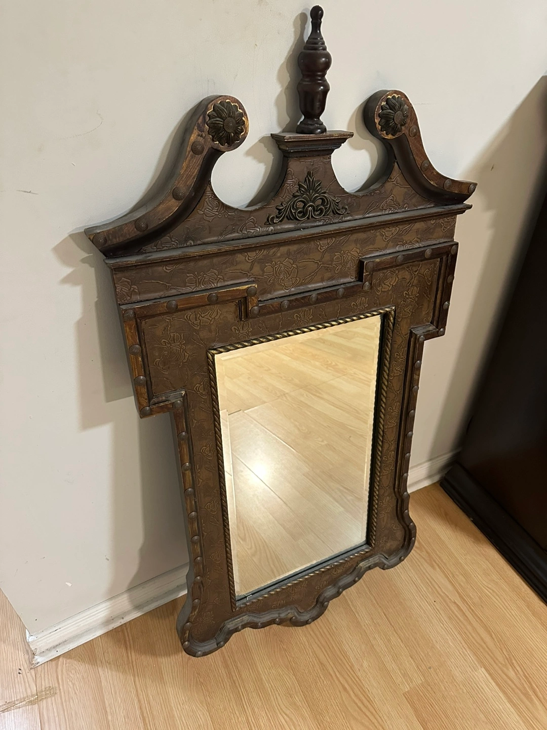 Beautiful decorative mirror. Features an ornate frame with embossed floral details and metal accents. Dark brown finish. Adds elegance to any room.