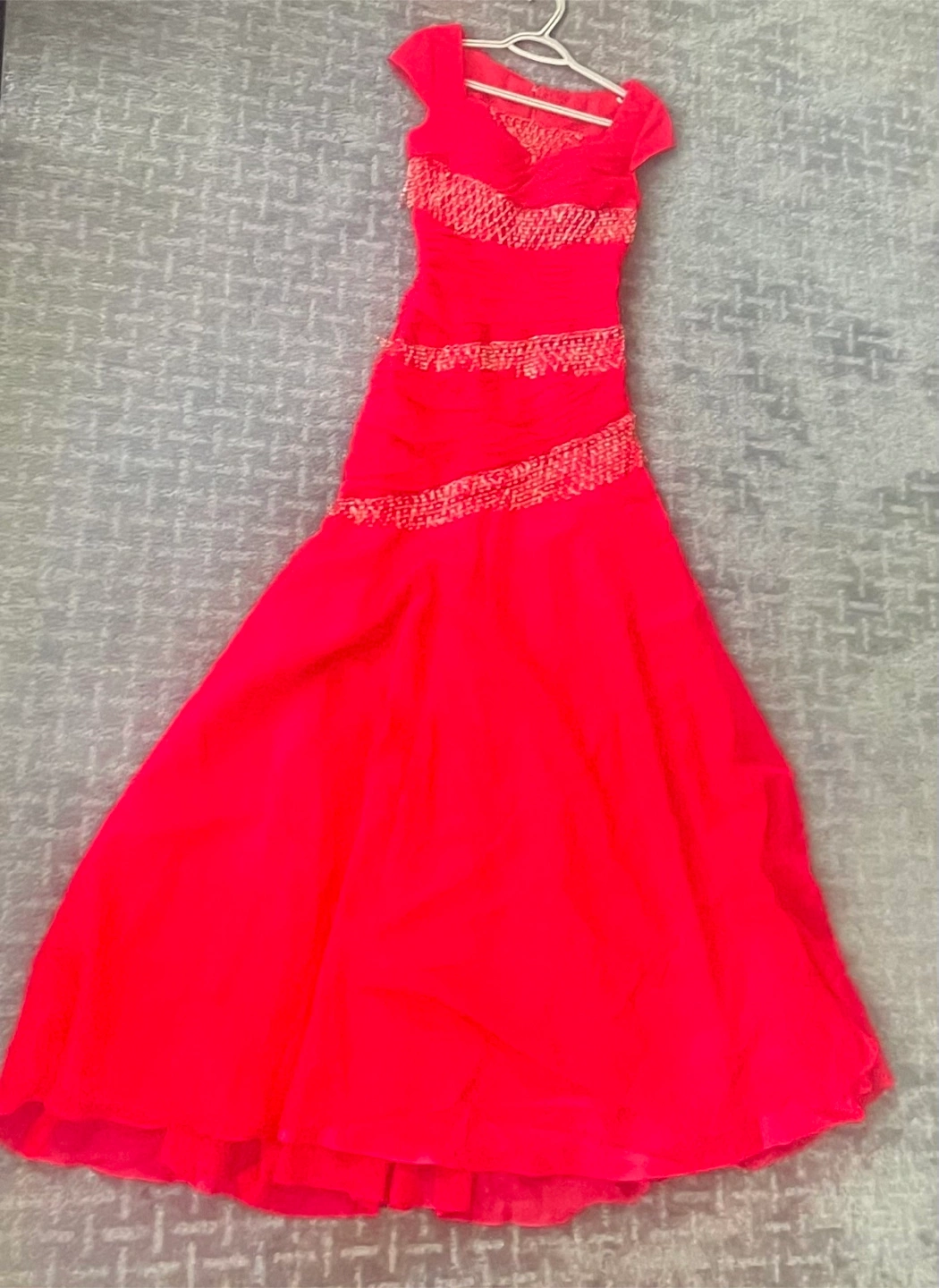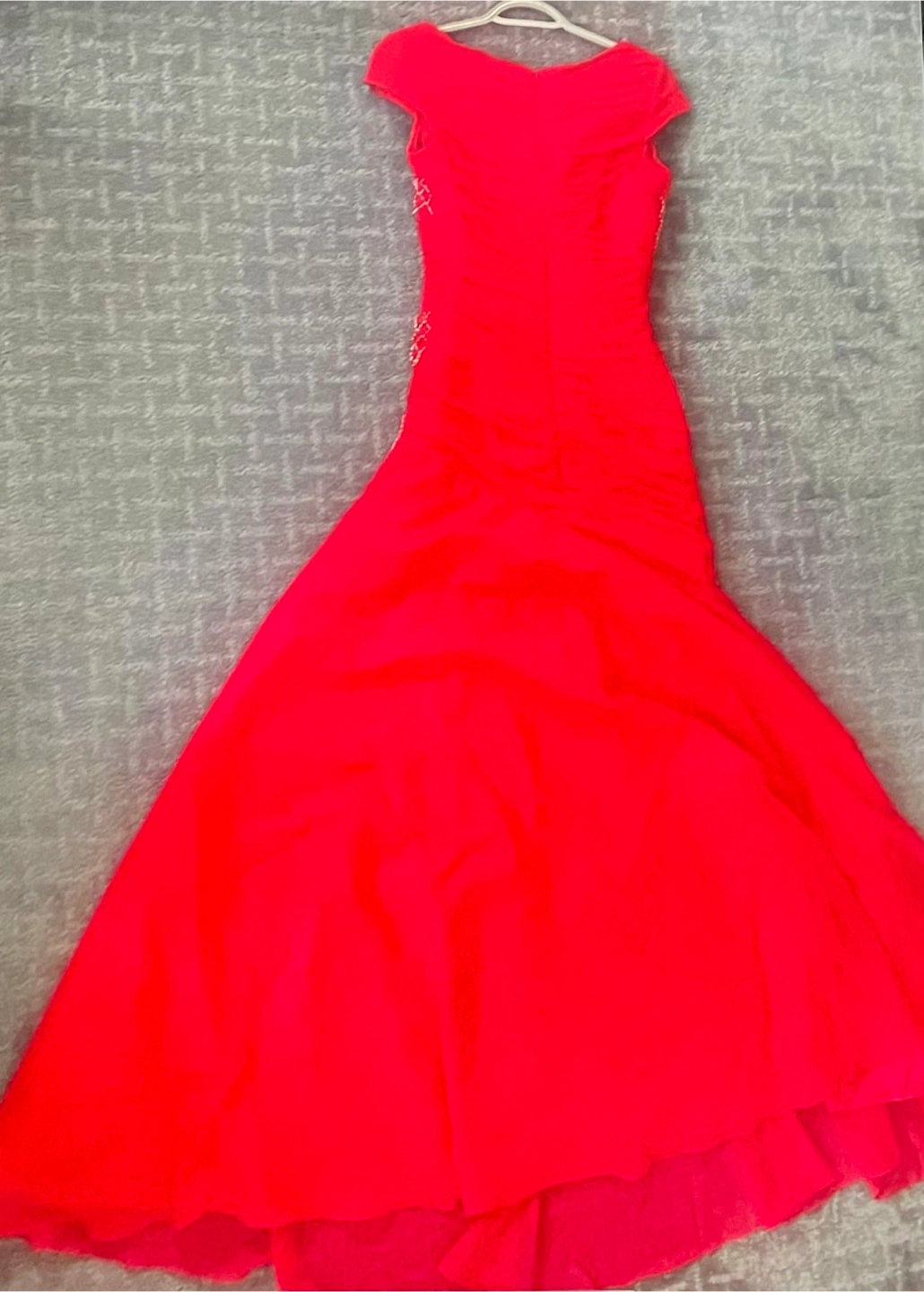 28Gorgeous red floor-length gown. Features a V-neck, short sleeves, and beautiful beaded accents. Fitted bodice and flowing skirt. Size small Perfect for prom, a wedding, or other special occasion.