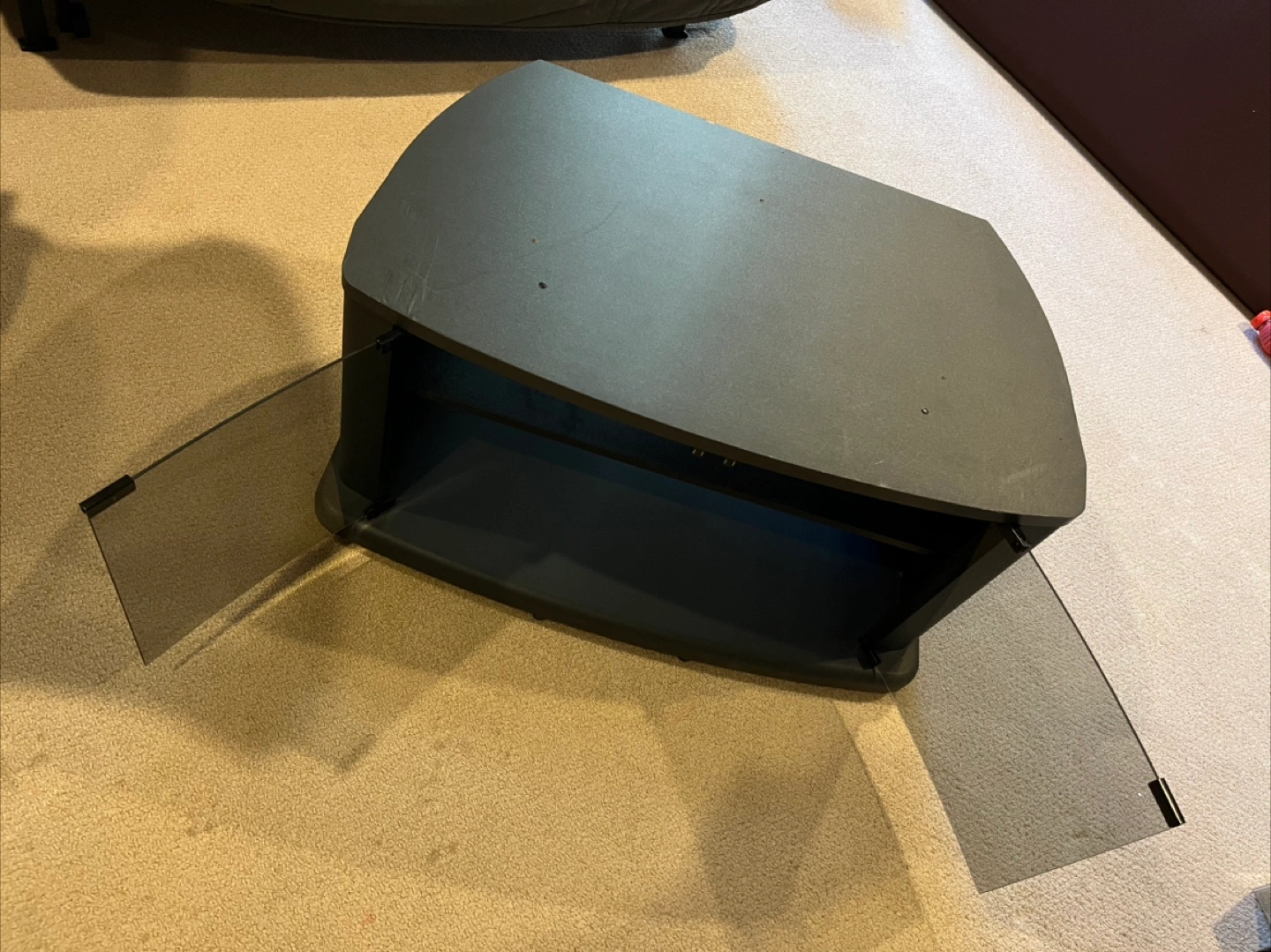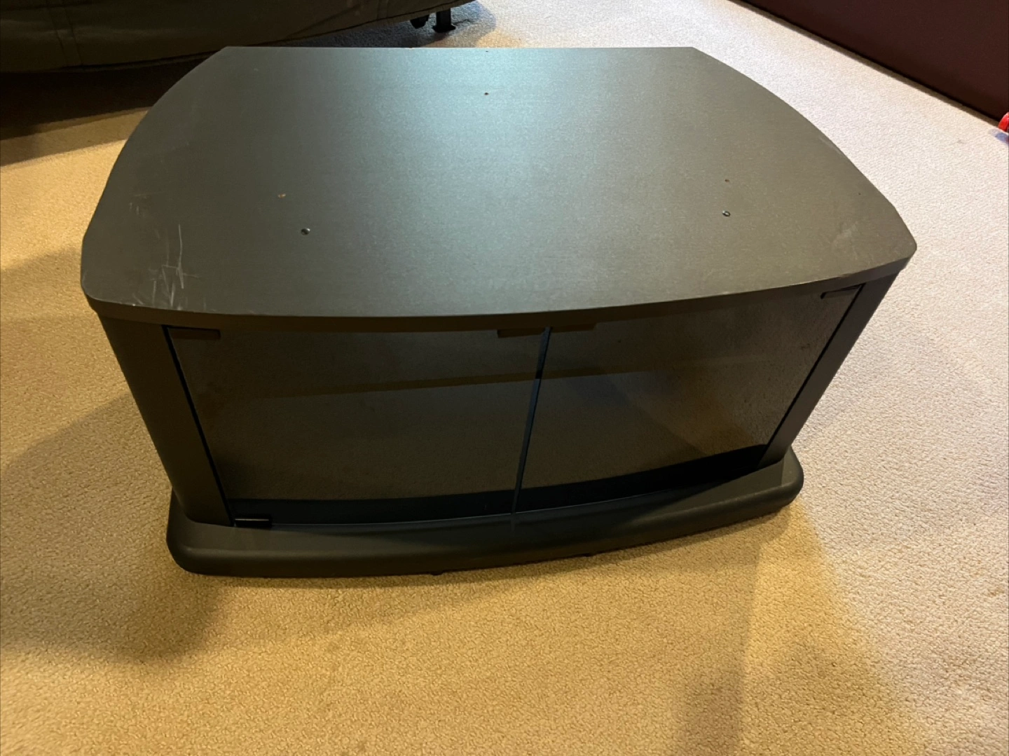 Small black TV stand with wheels. Features two glass doors and an open shelf. Some minor scratches on top.