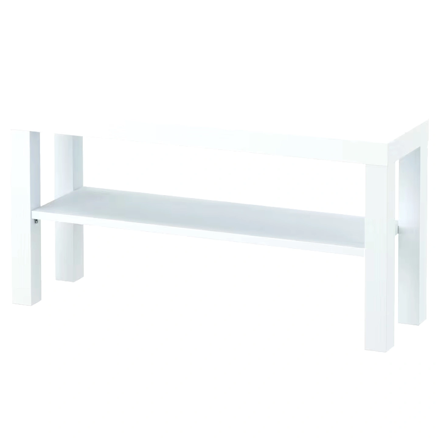 Simple white TV stand. Two-tiered design. Ideal for smaller spaces. Great for living rooms or bedrooms. Clean and modern style.