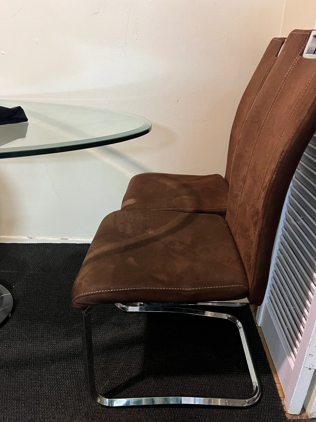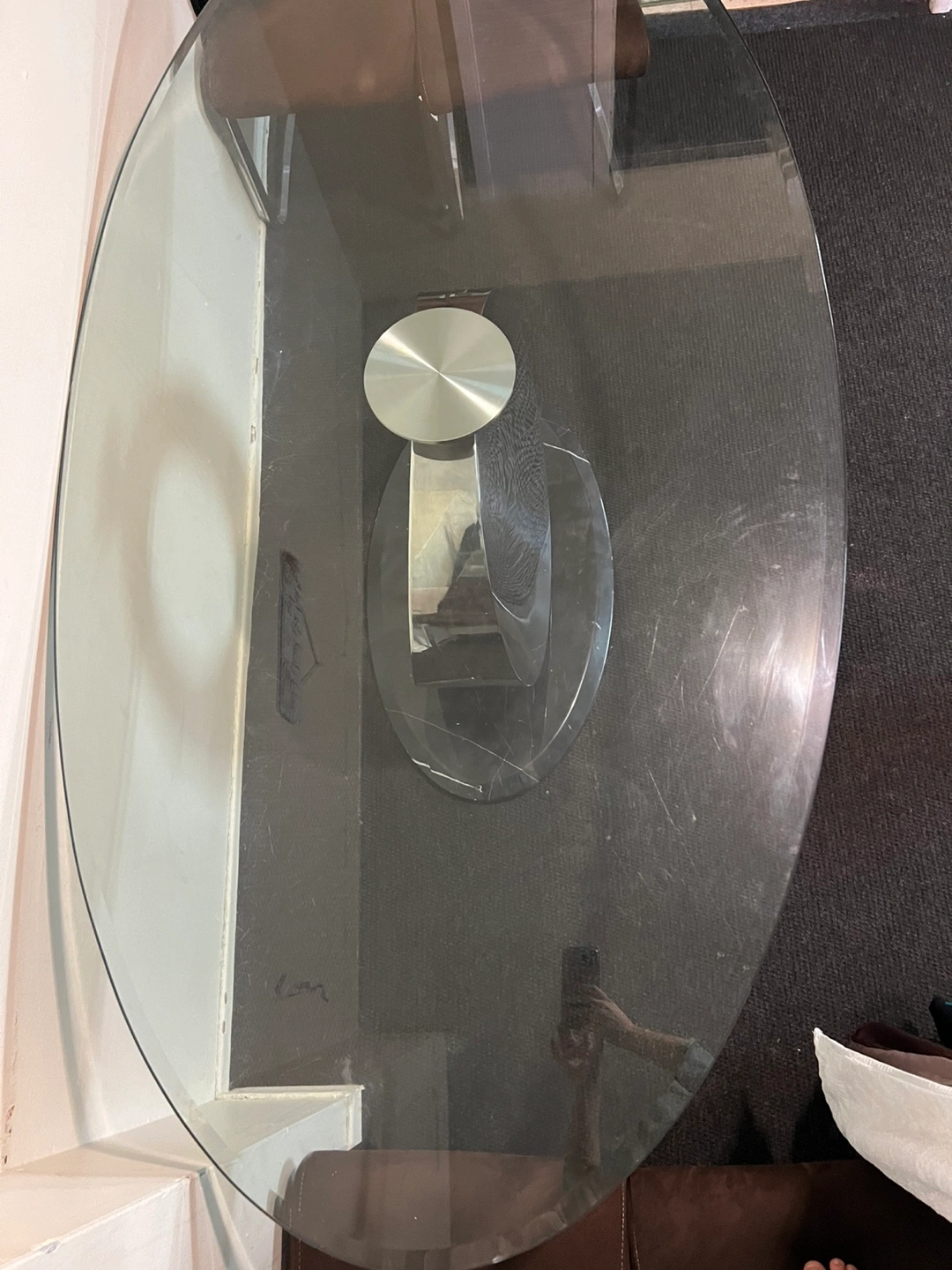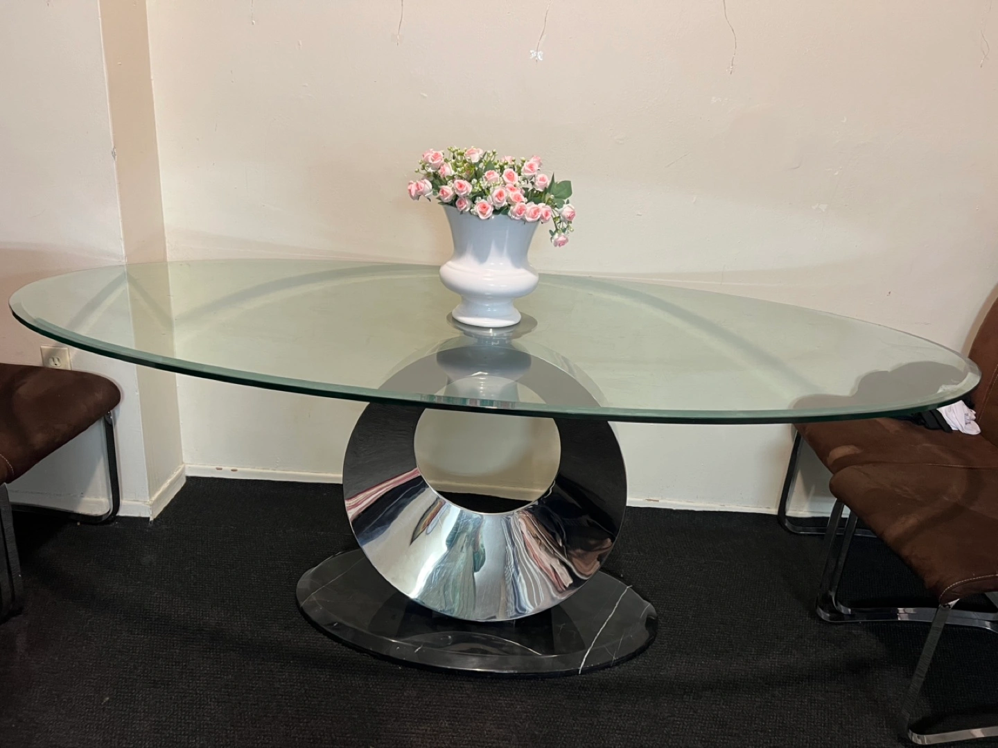 Oval glass top table. Chrome and marble base. Four brown fabric chairs included. Minimalist design. Some minor scratches on the glass. But it’s in really good condition.