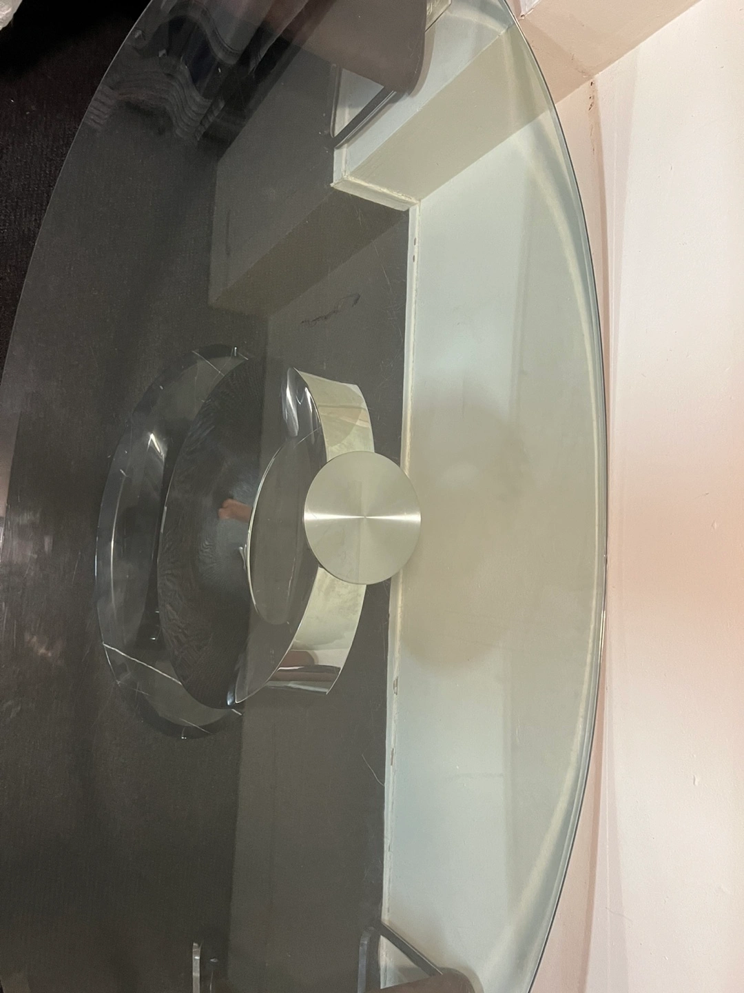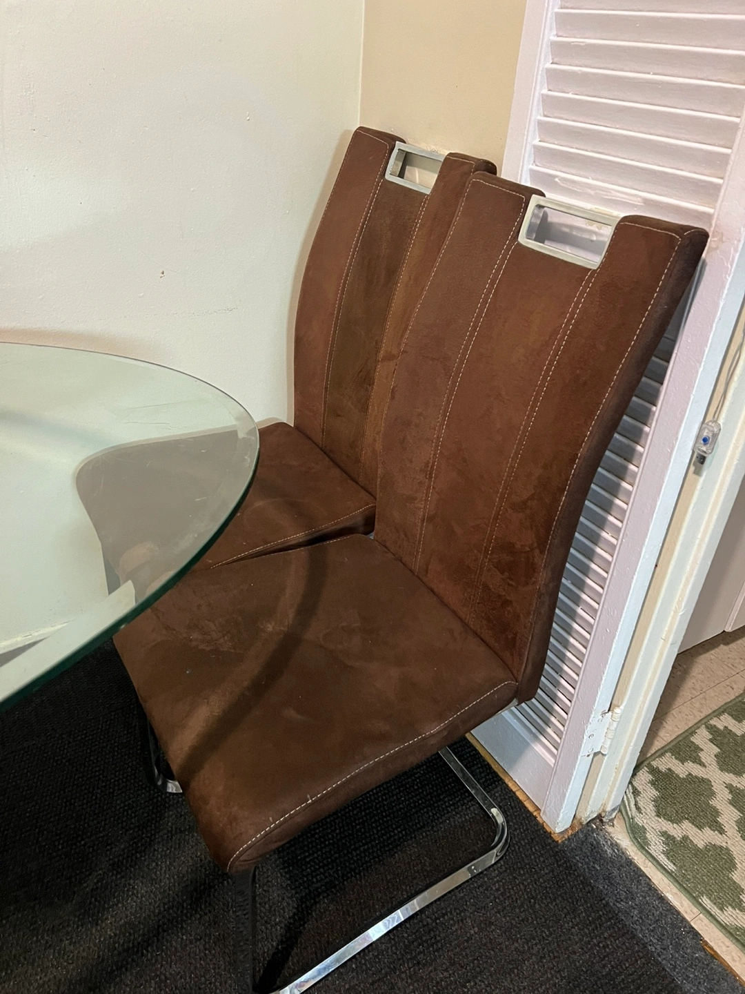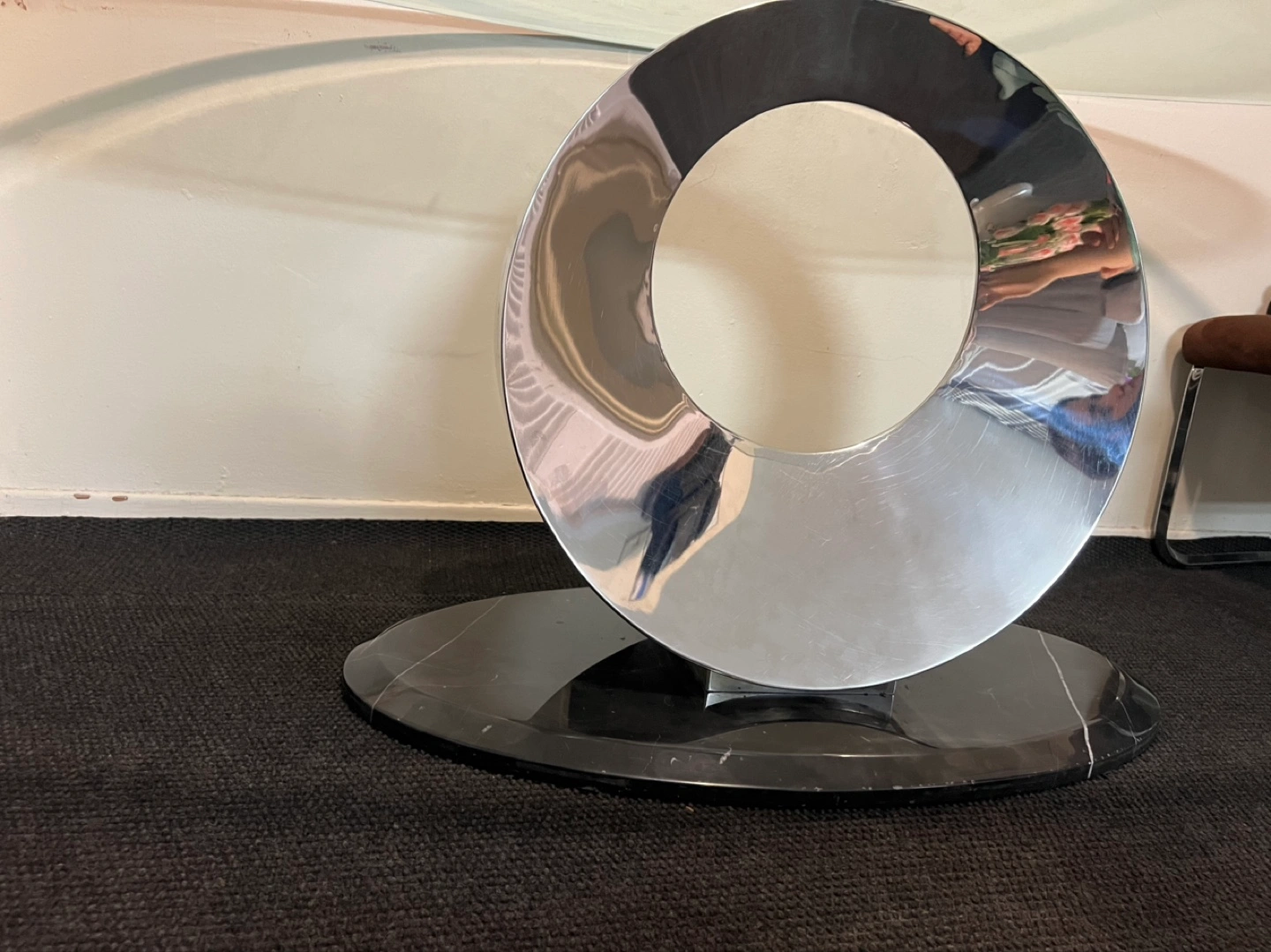 Oval glass top table. Chrome and marble base. Four brown fabric chairs included. Minimalist design. Some minor scratches on the glass. But it’s in really good condition.