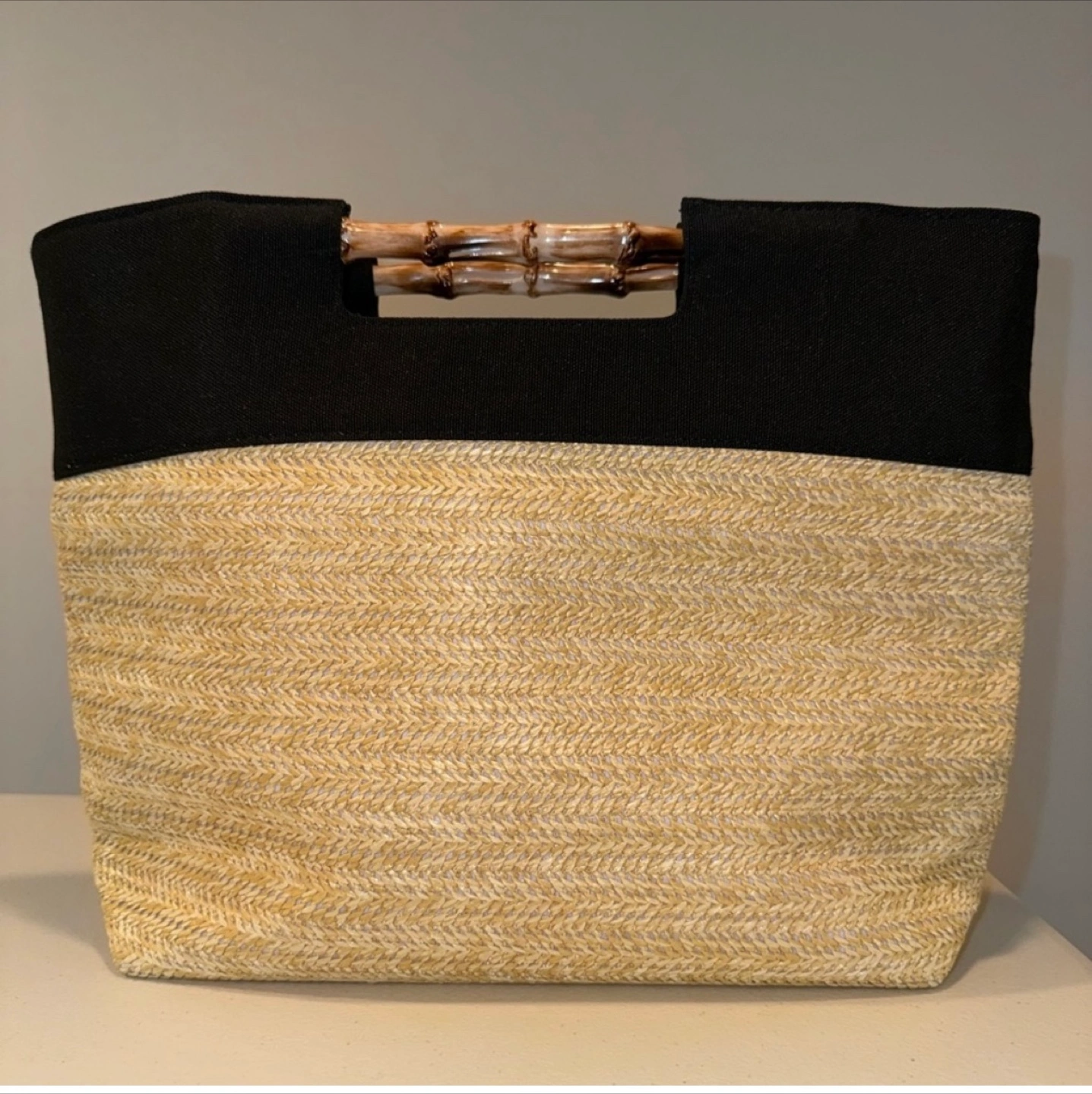 New . Natural straw-like material. Black fabric top. Bamboo handles. Perfect summer bag.