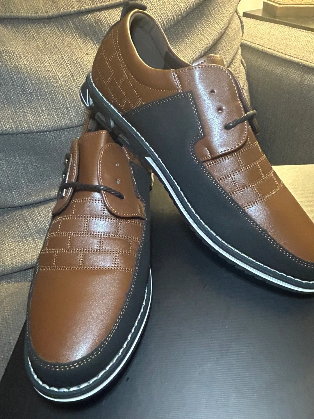 Stylish men's casual shoes. Brown and black colour block design. PU synthetic Leather-look material. Lace-up closure. Comfortable sole. Great for everyday wear.
