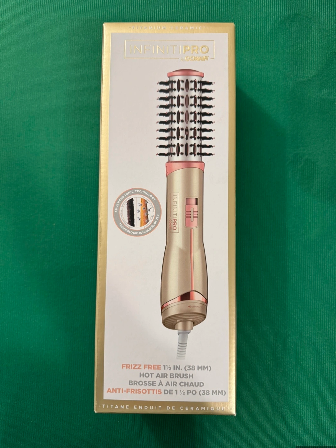 1 1/2 inch barrel. Rose gold and champagne color. Powerful ionic generator for volume. Two heat settings plus cool shot button. Nylon and ball-tipped bristles. Six-foot swivel cord. 500 watts.