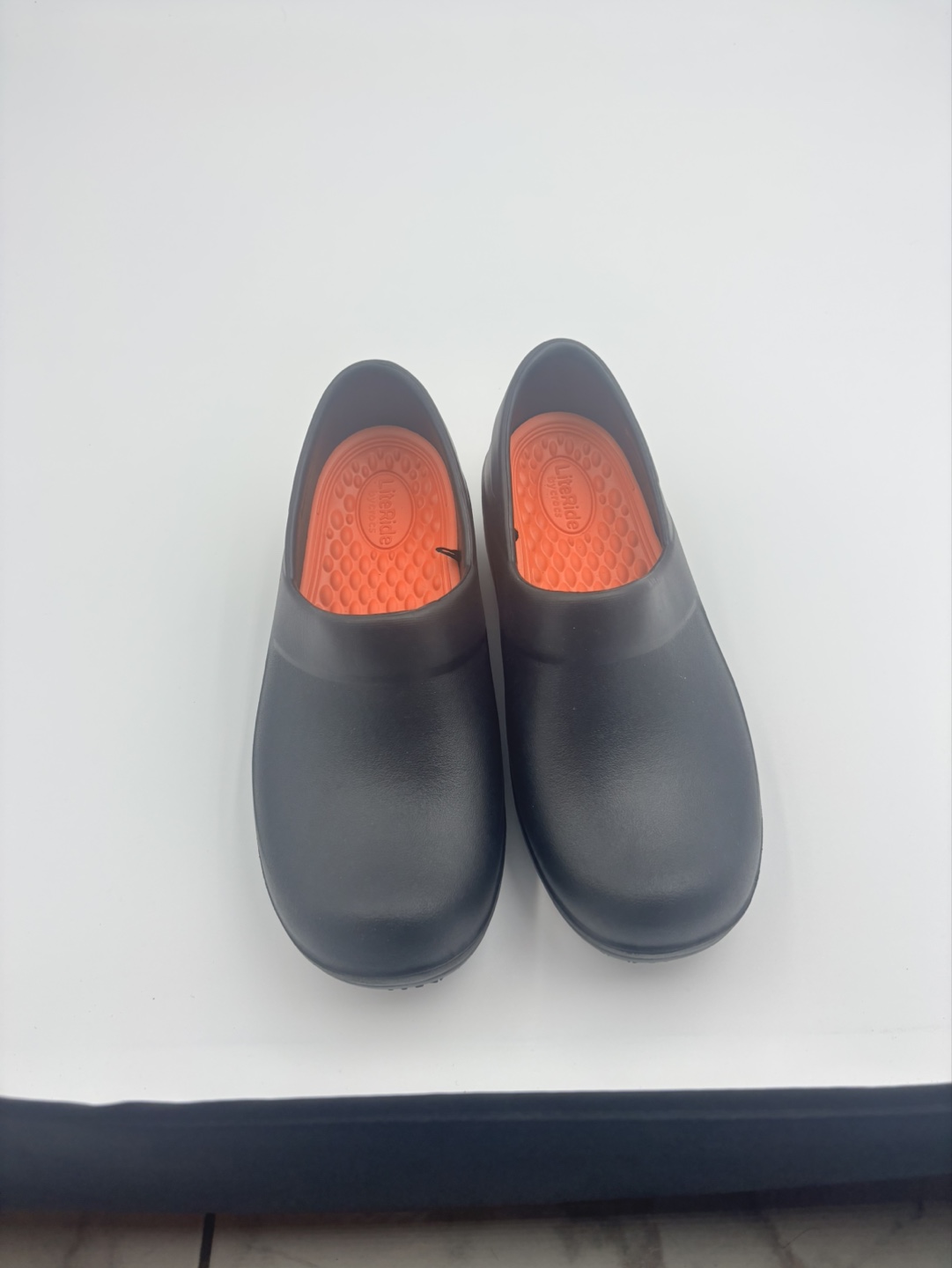 Pair of black Crocs clogs. Size 4/5. Slip-on design. Comfortable footbed. Durable sole. Great for work or casual wear.