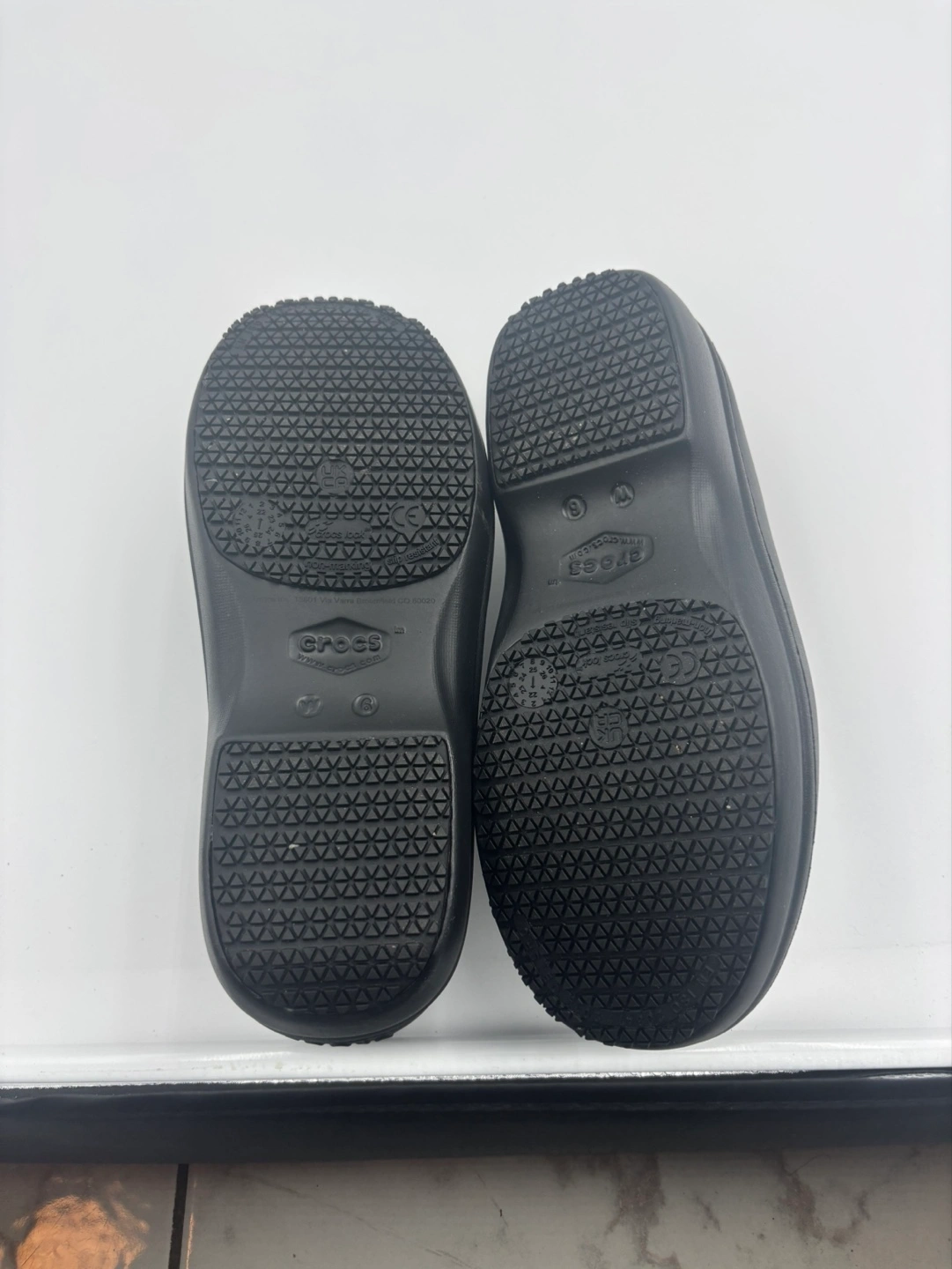 Pair of black Crocs clogs. Size 4/5. Slip-on design. Comfortable footbed. Durable sole. Great for work or casual wear.