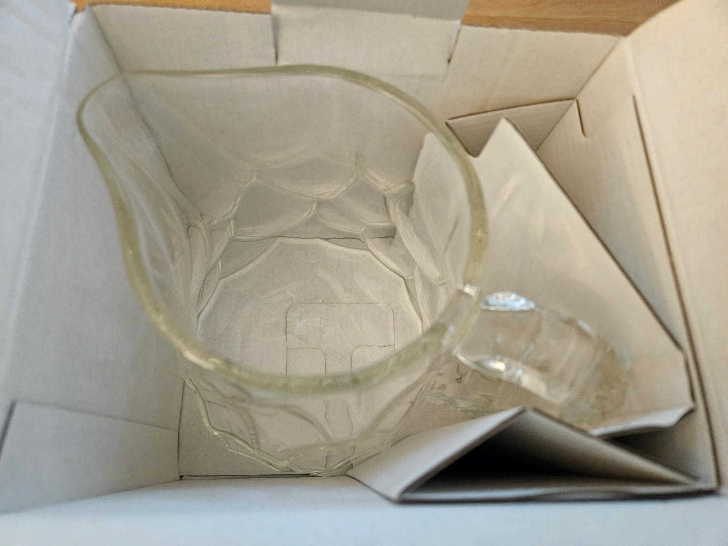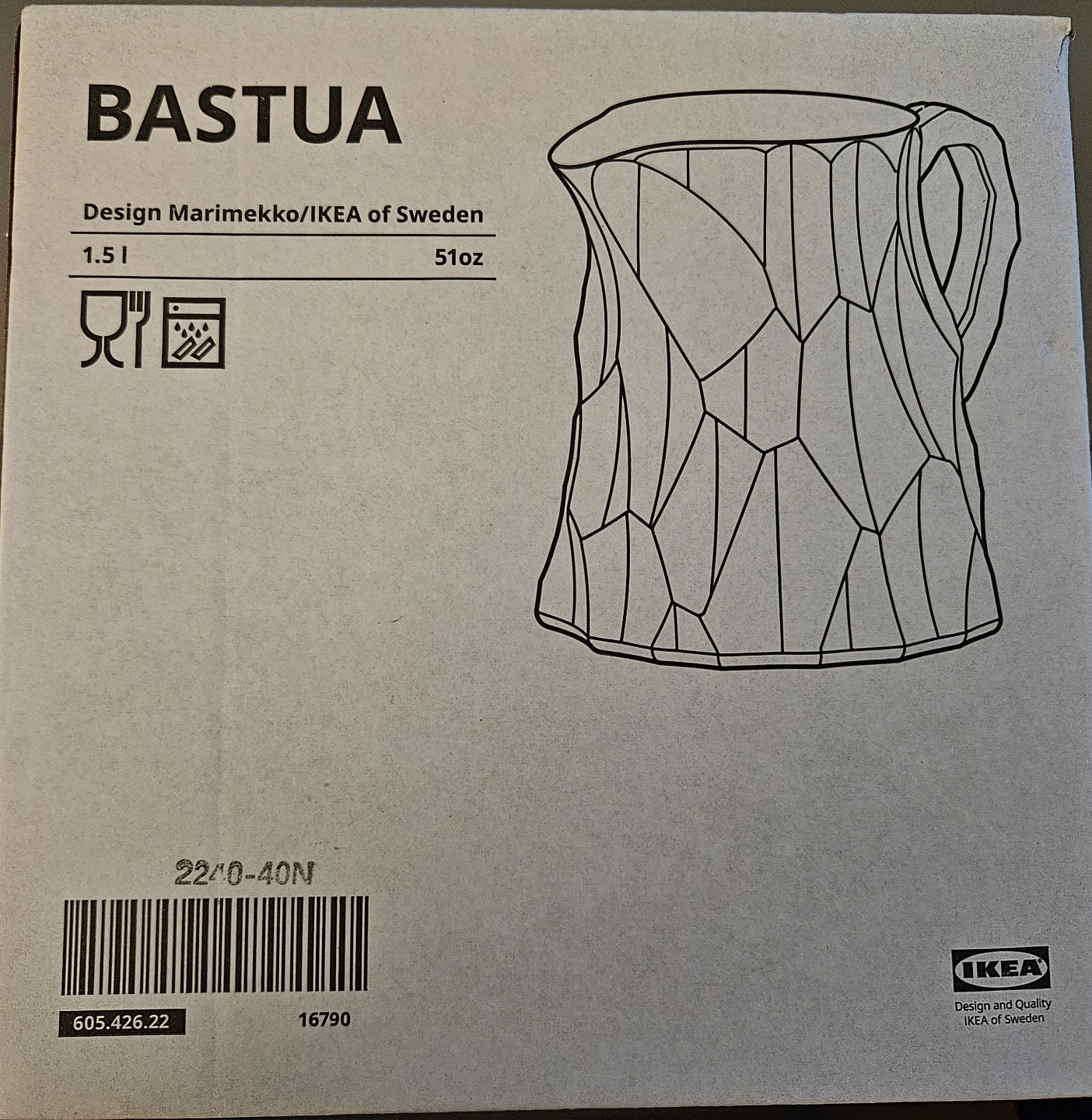 Brand new, never used IKEA BASTUA glass pitcher. Designed by Marimekko. Holds 1.5 litres (51 oz). Dishwasher safe. Unique geometric design. Perfect for serving beverages.