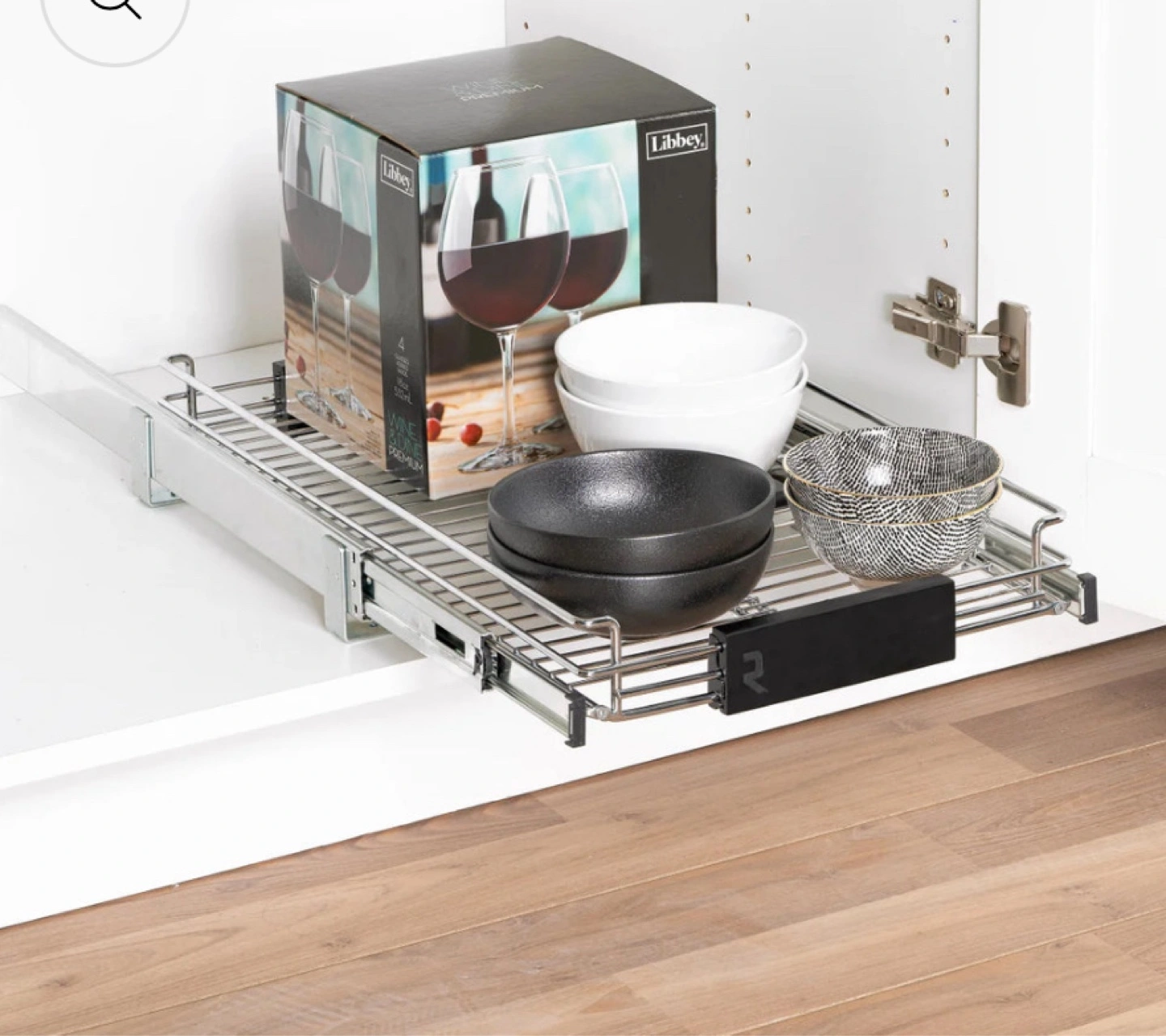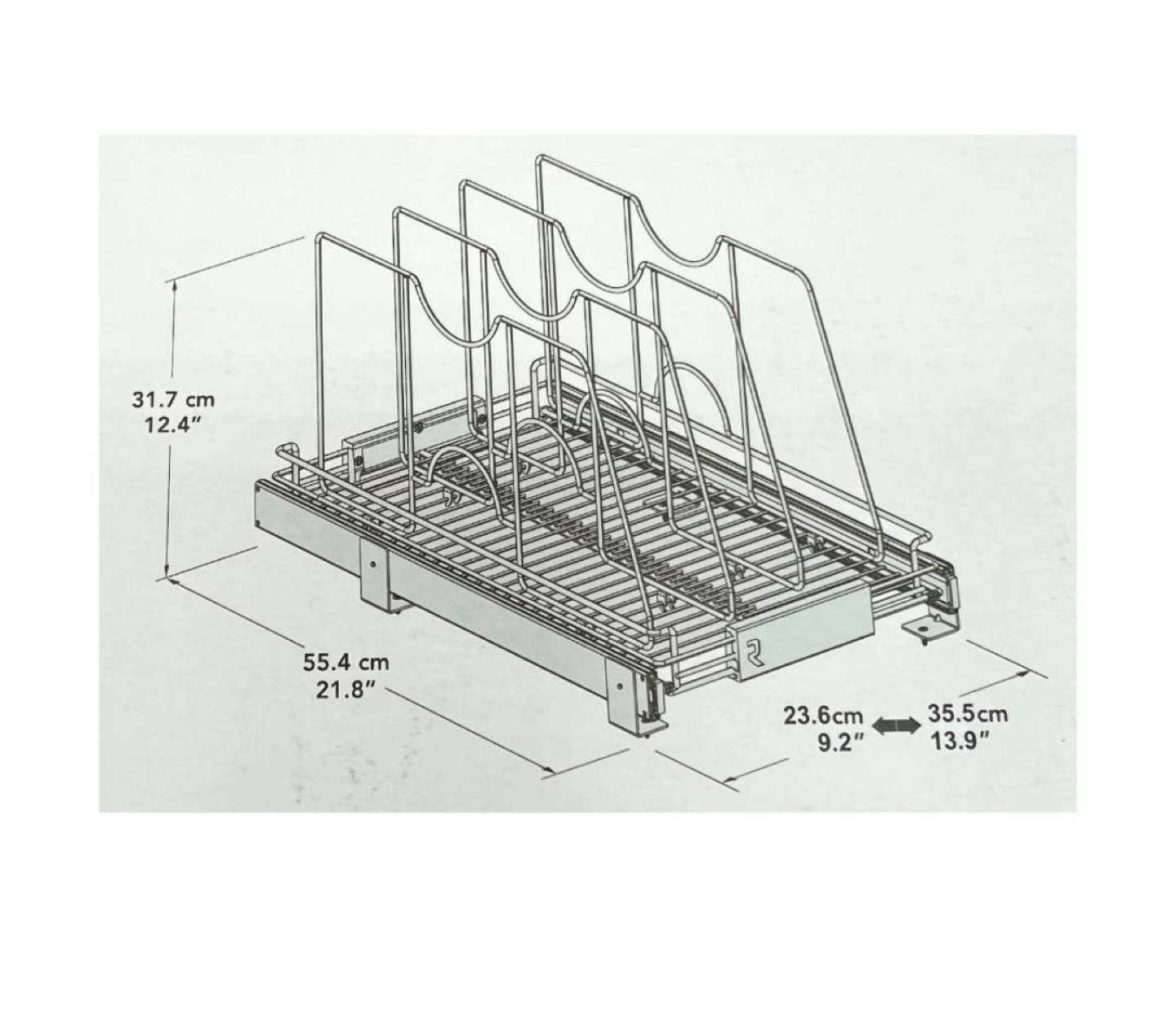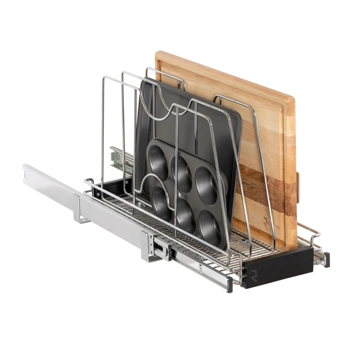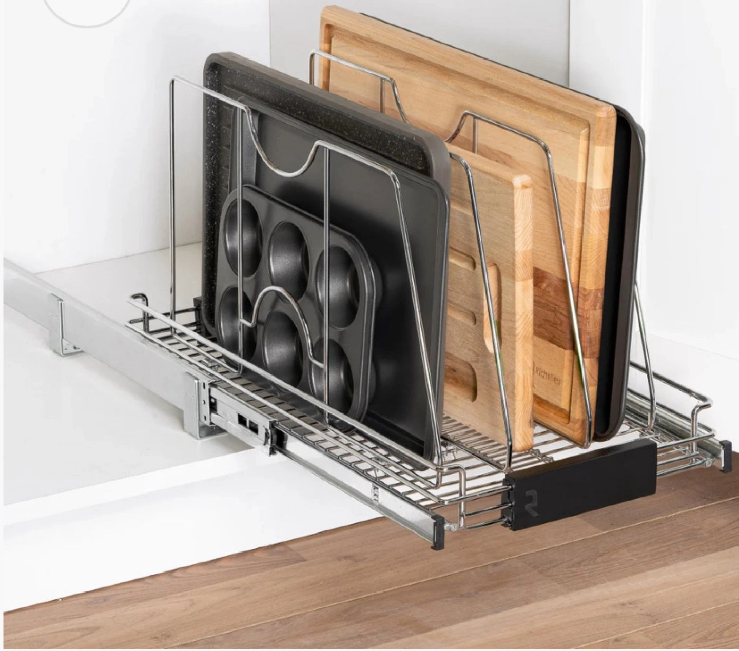 Organize your kitchen with this new Richelieu adjustable pull-out pan divider, designed for easy under-cabinet installation and storage of trays, baking sheets, and cutting boards.