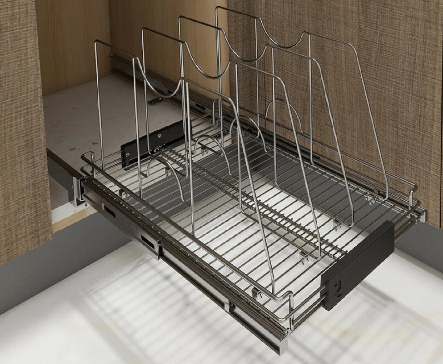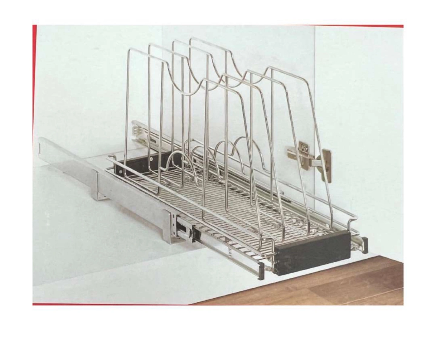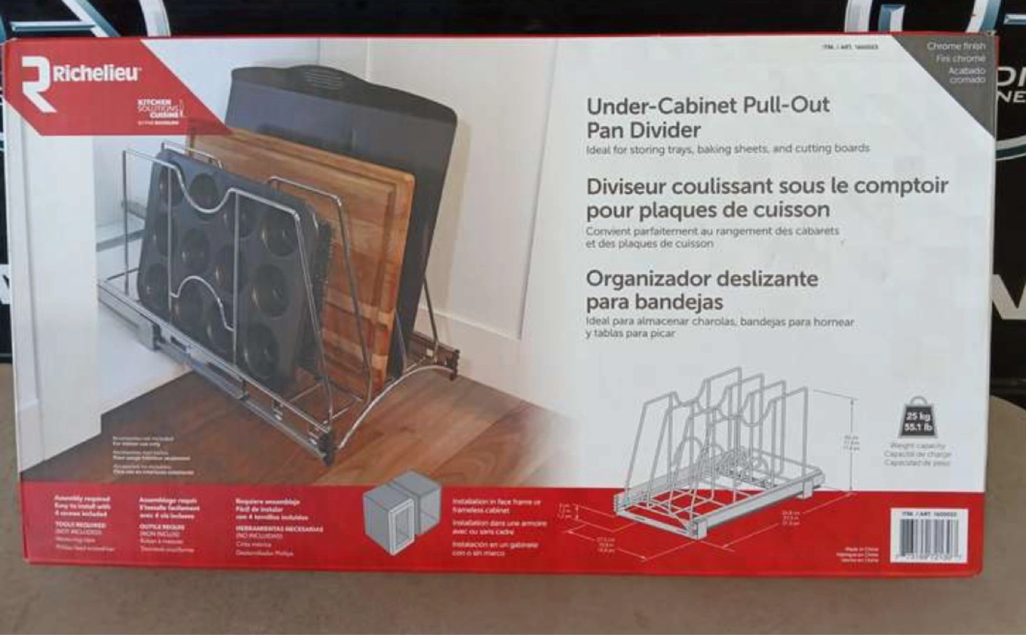 Organize your kitchen with this new Richelieu adjustable pull-out pan divider, designed for easy under-cabinet installation and storage of trays, baking sheets, and cutting boards.
