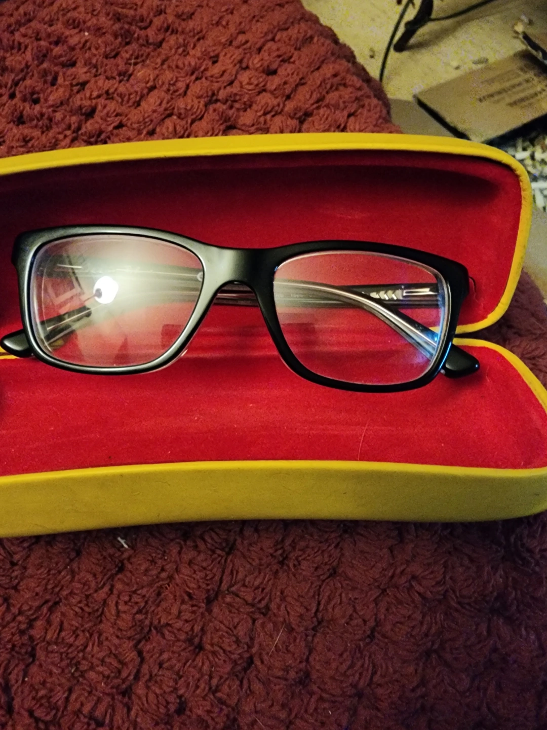 Ray-Ban eyeglasses. Black rectangular frames. Clear lenses. Comes with a yellow hard case. Pre-owned. I bought these to put my own prescription in but I ended up getting something else they have a prescription in them not mine lol