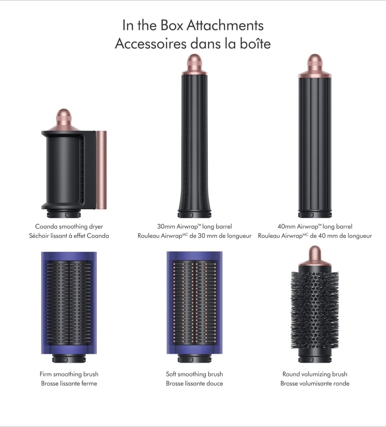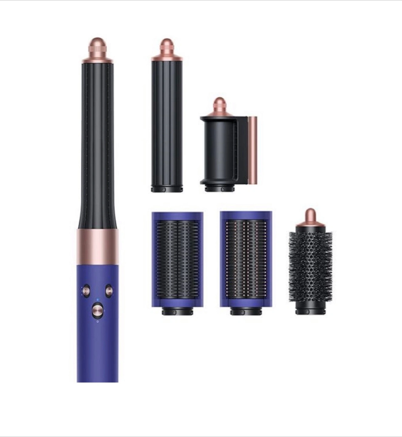 Dyson Airwrap styler. Includes multiple attachments: 30mm and 40mm barrels, firm smoothing brush, soft smoothing brush, and round volumizing brush. Complete set, comes in a purple carrying case
