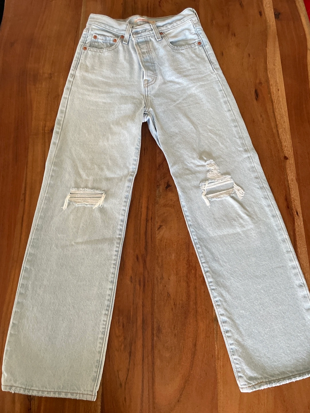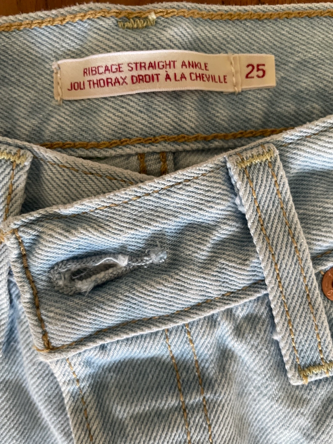 Light wash denim. Straight leg. Ankle length. Distressed details. Size 25.