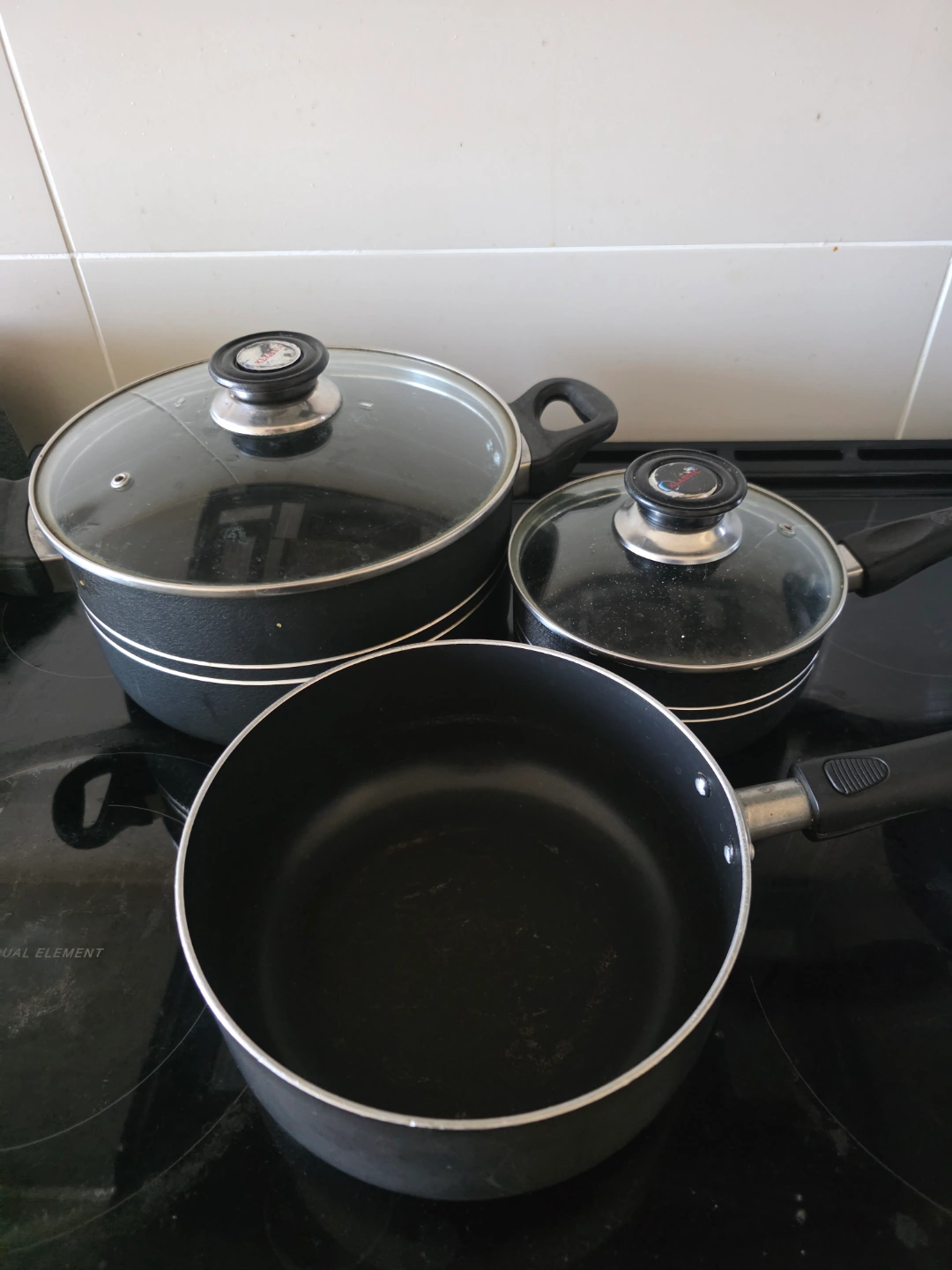 Three-piece cookware set. Includes one large pot, one medium saucepan, and one small saucepan. All feature glass lids and black exteriors. Good for everyday cooking.