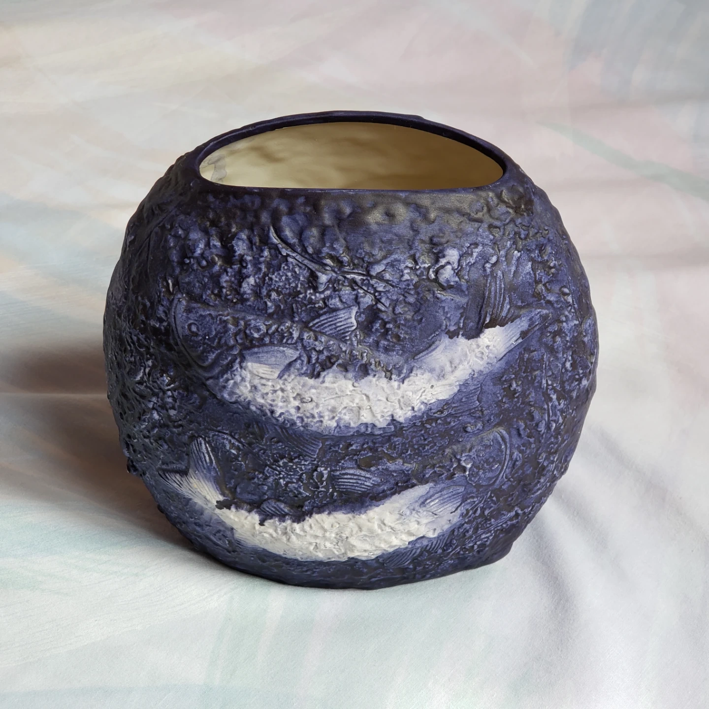 Beautiful dark blue ceramic planter featuring a narrow oval opening, textured surface and a white fish design