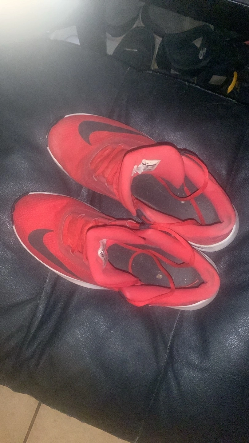 Pair of red Nike basketball shoes. Mid-top style. Good for the court or casual wear. Good condition.