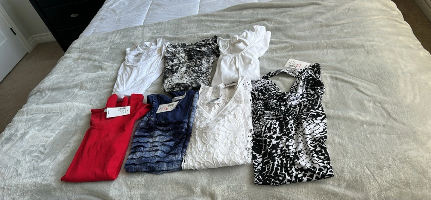 7 women's tops. Various colours and patterns. Includes sleeveless and short-sleeve options. Mostly size small. Five are newwith tags the other two are in new condition porch pick up Walker’s line and Country Club