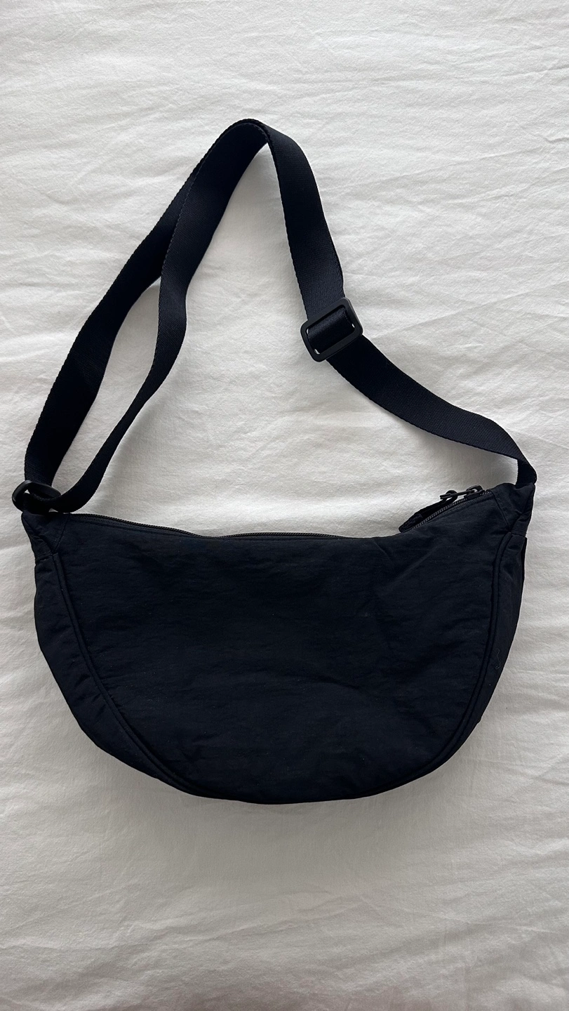 Small black nylon shoulder bag. Adjustable strap. Zipper closure. Great for everyday use.