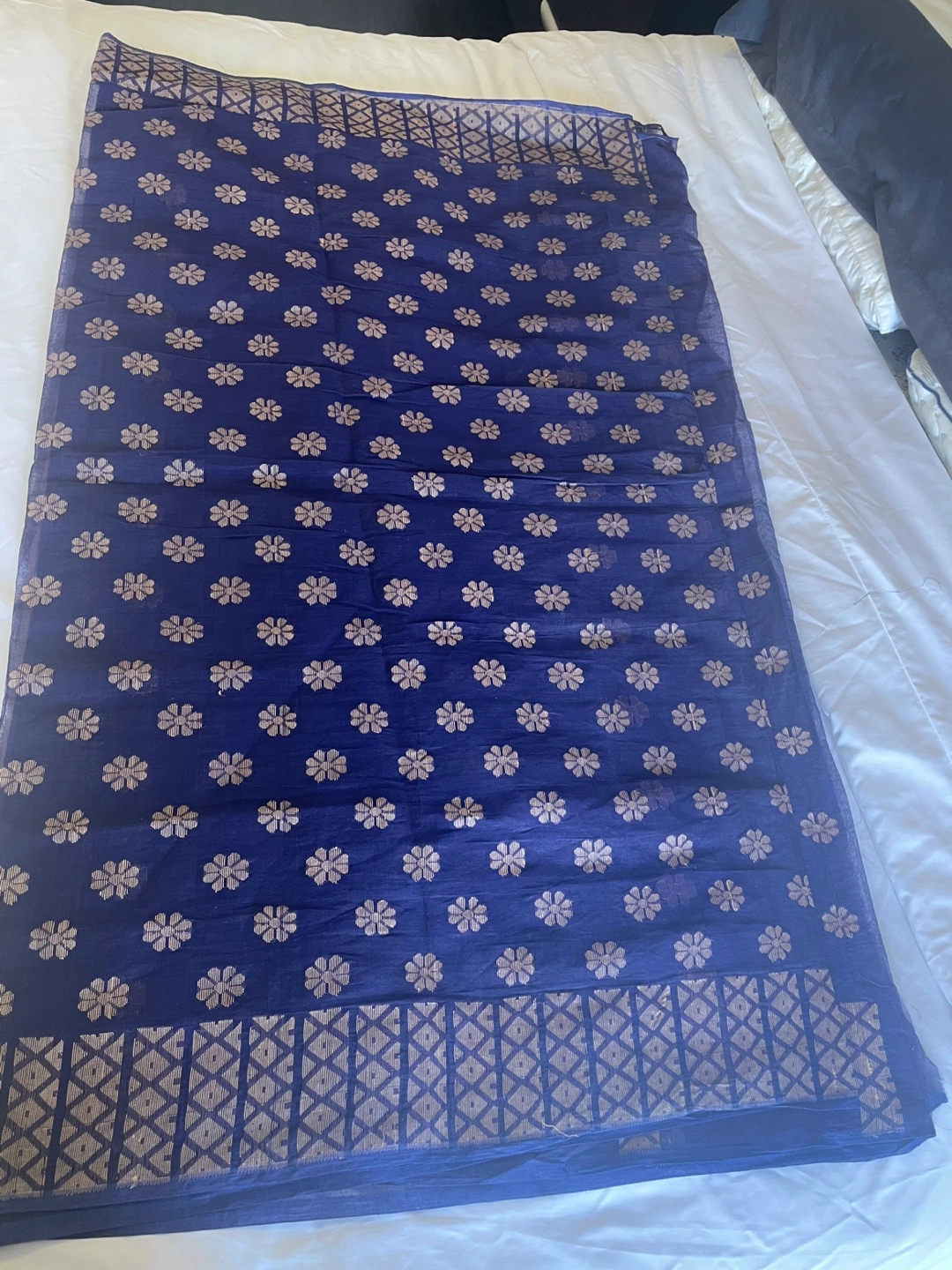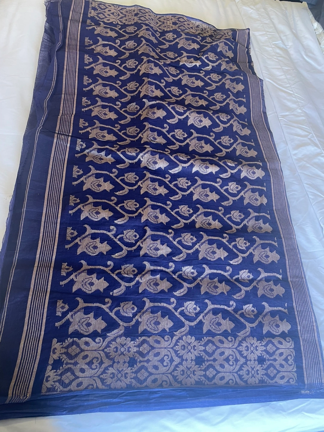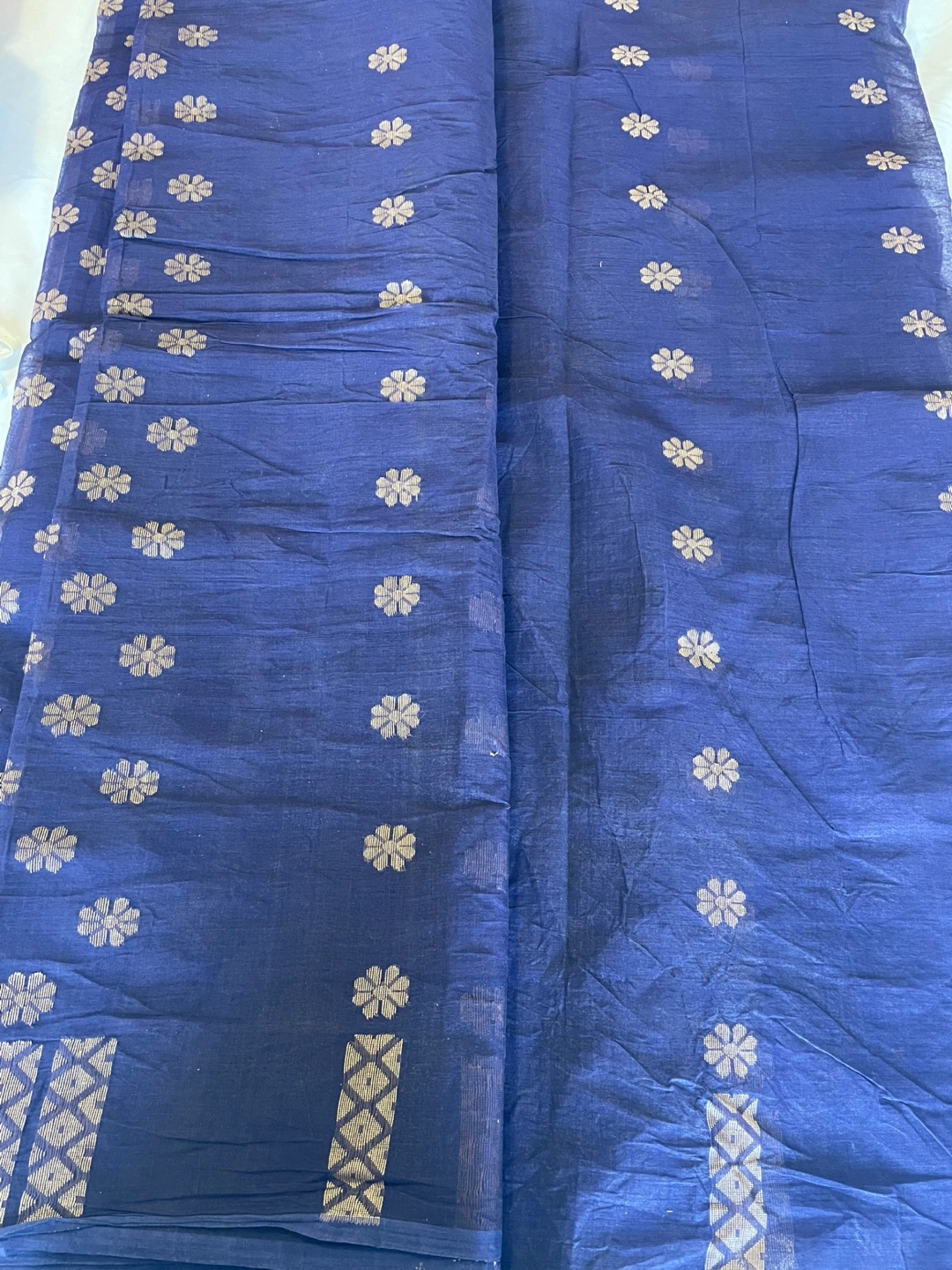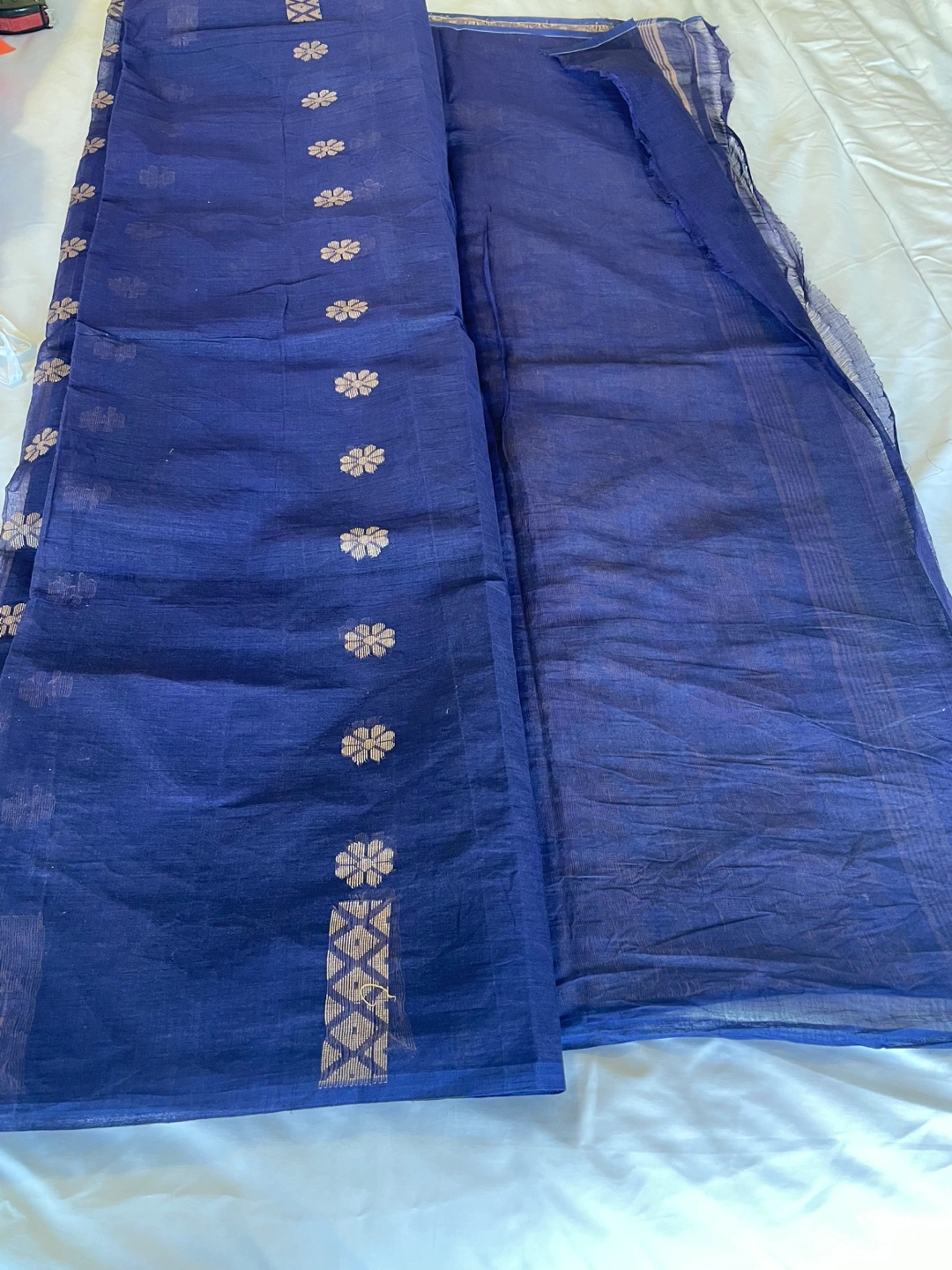 Elegant cotton taant saree. Features a deep blue colour with gold floral detailing.