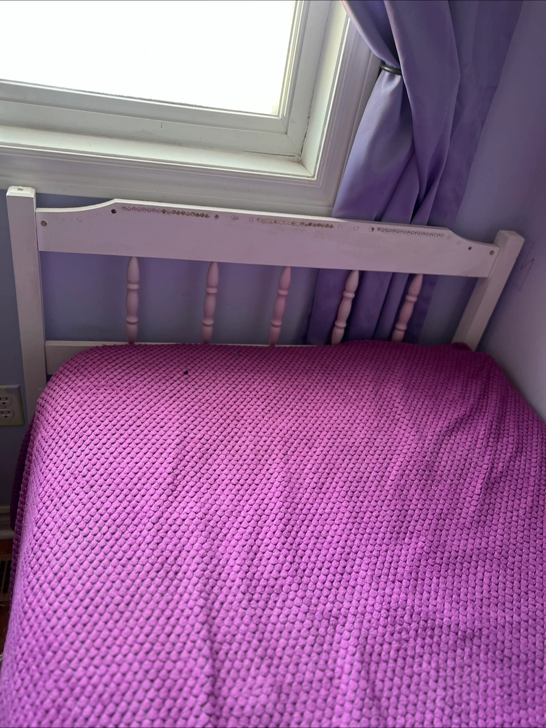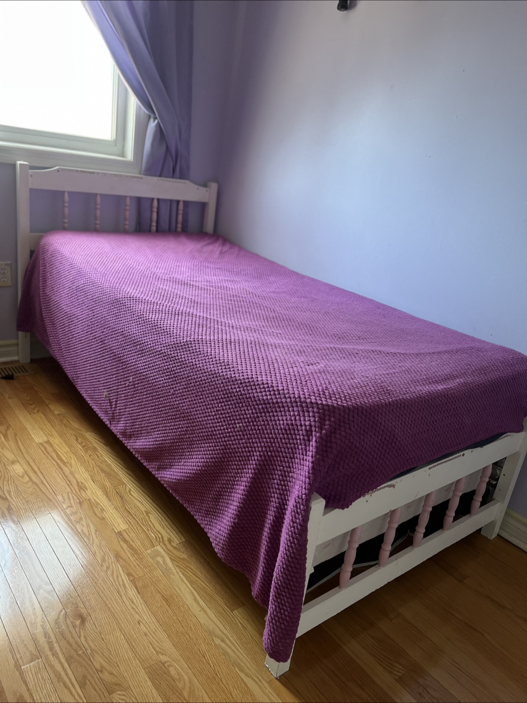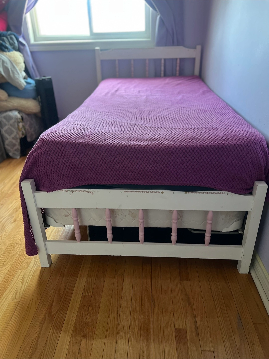 Wooden twin bed frame. White colour. Features pink spindles along the headboard and footboard.