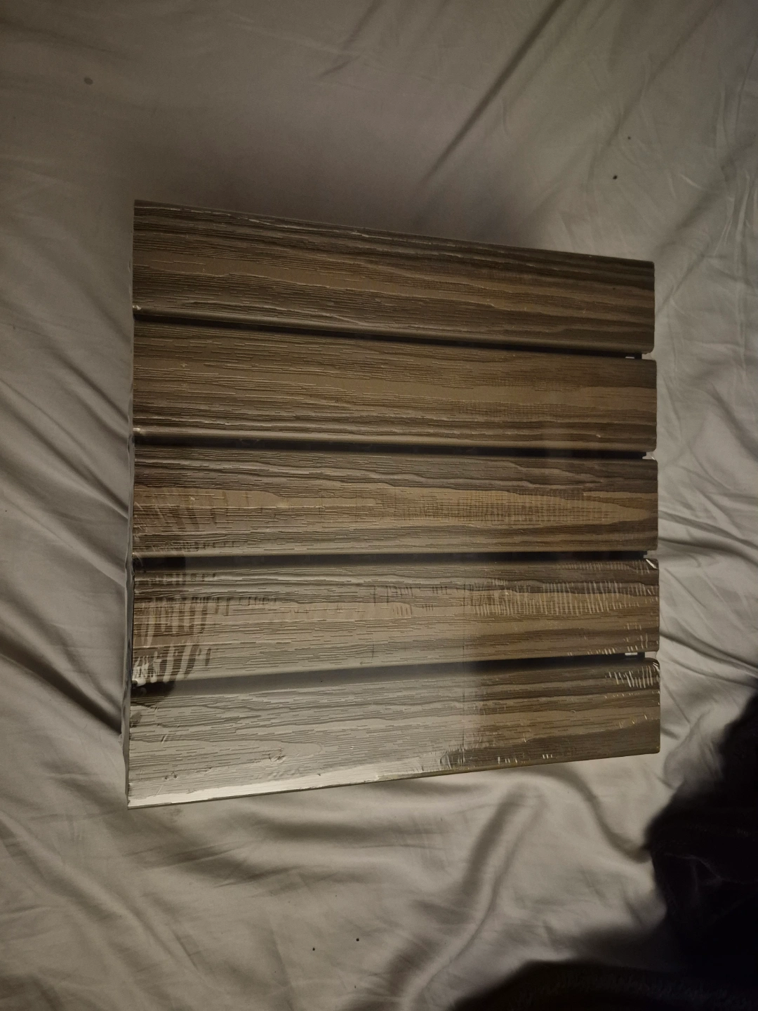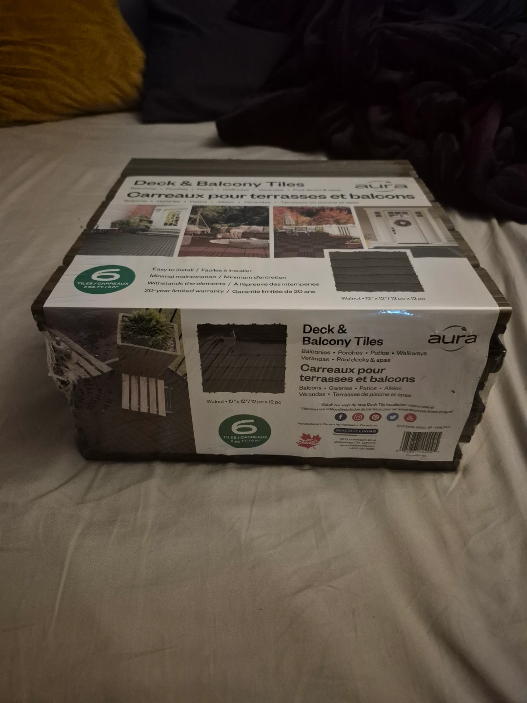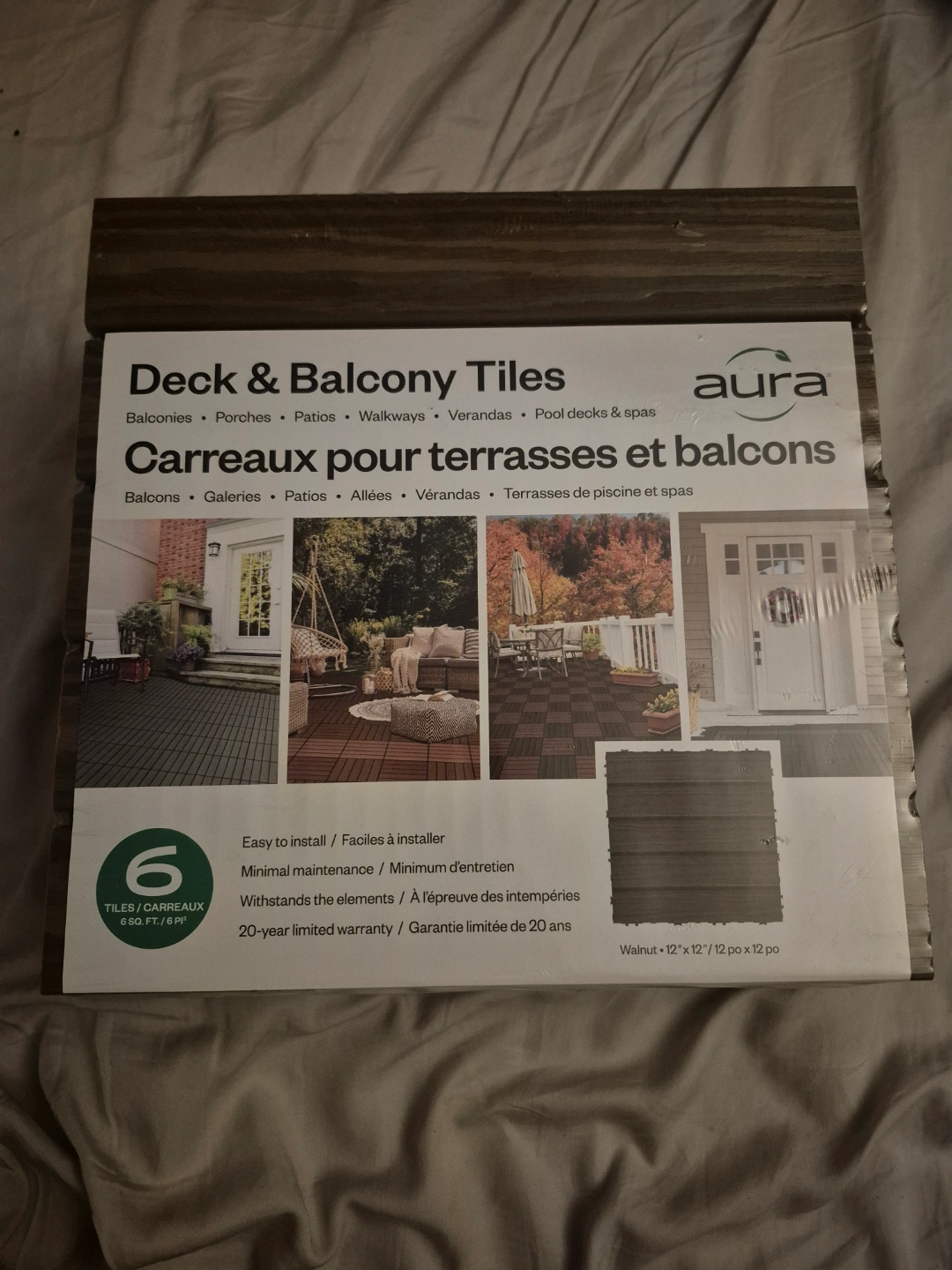 99New in box. Six 12"x12" deck and balcony tiles. Easy to install. Minimal maintenance. Weather resistant. 20-year limited warranty. 27 total available pick up in westend