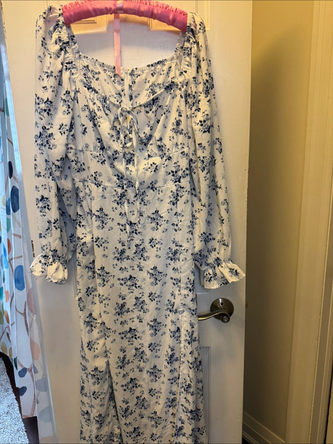 White maxi dress with blue floral print. Square neckline and long sleeves. Side split. Never worn.