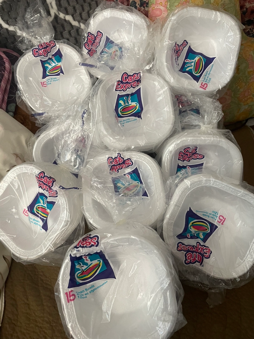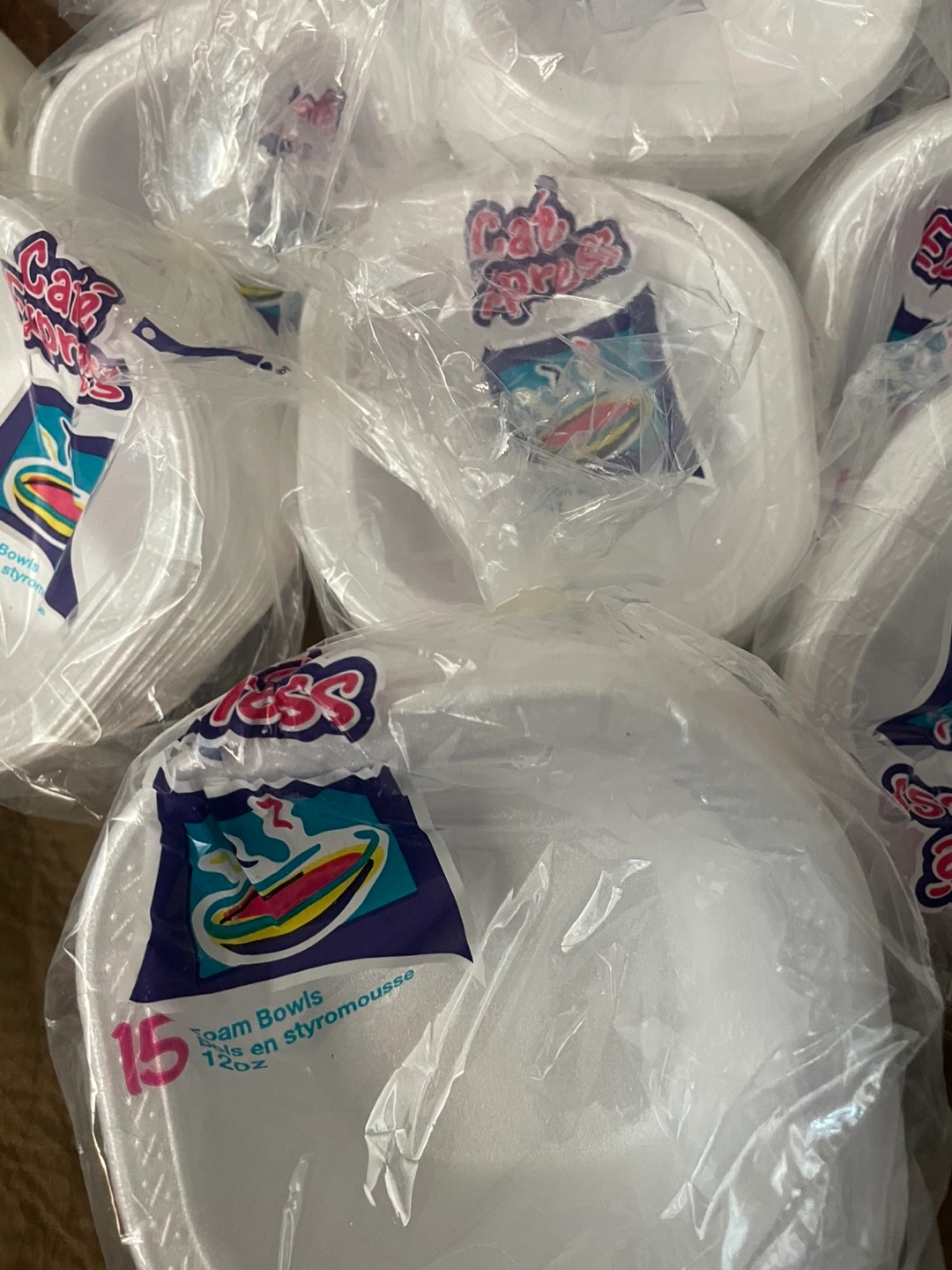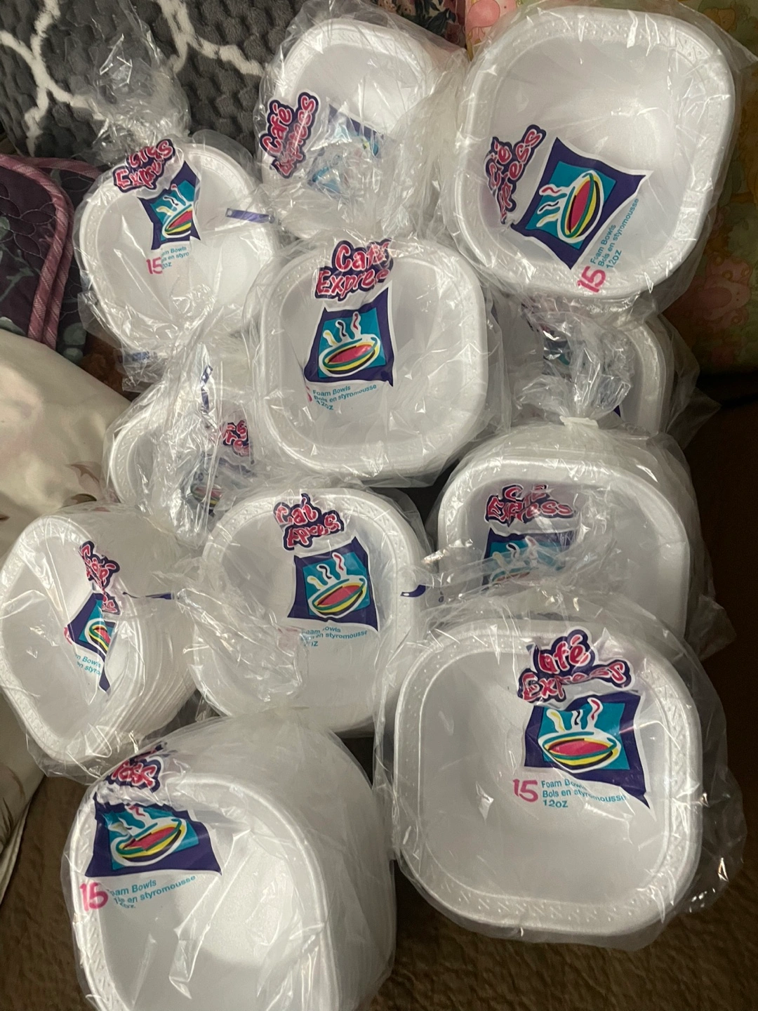 180 pieces white foam bowls. 12 oz capacity. Individually packaged in plastic. Great for parties or events.each bag 15 pieces I have 12 bags $3 each bag pick up Markham and Lawrence