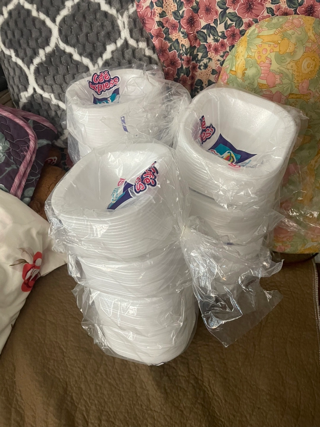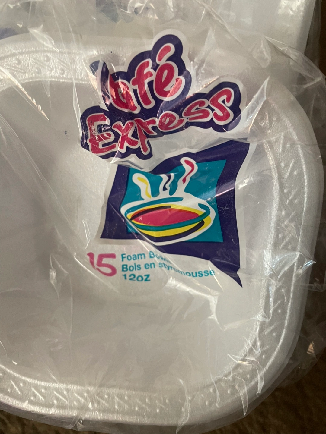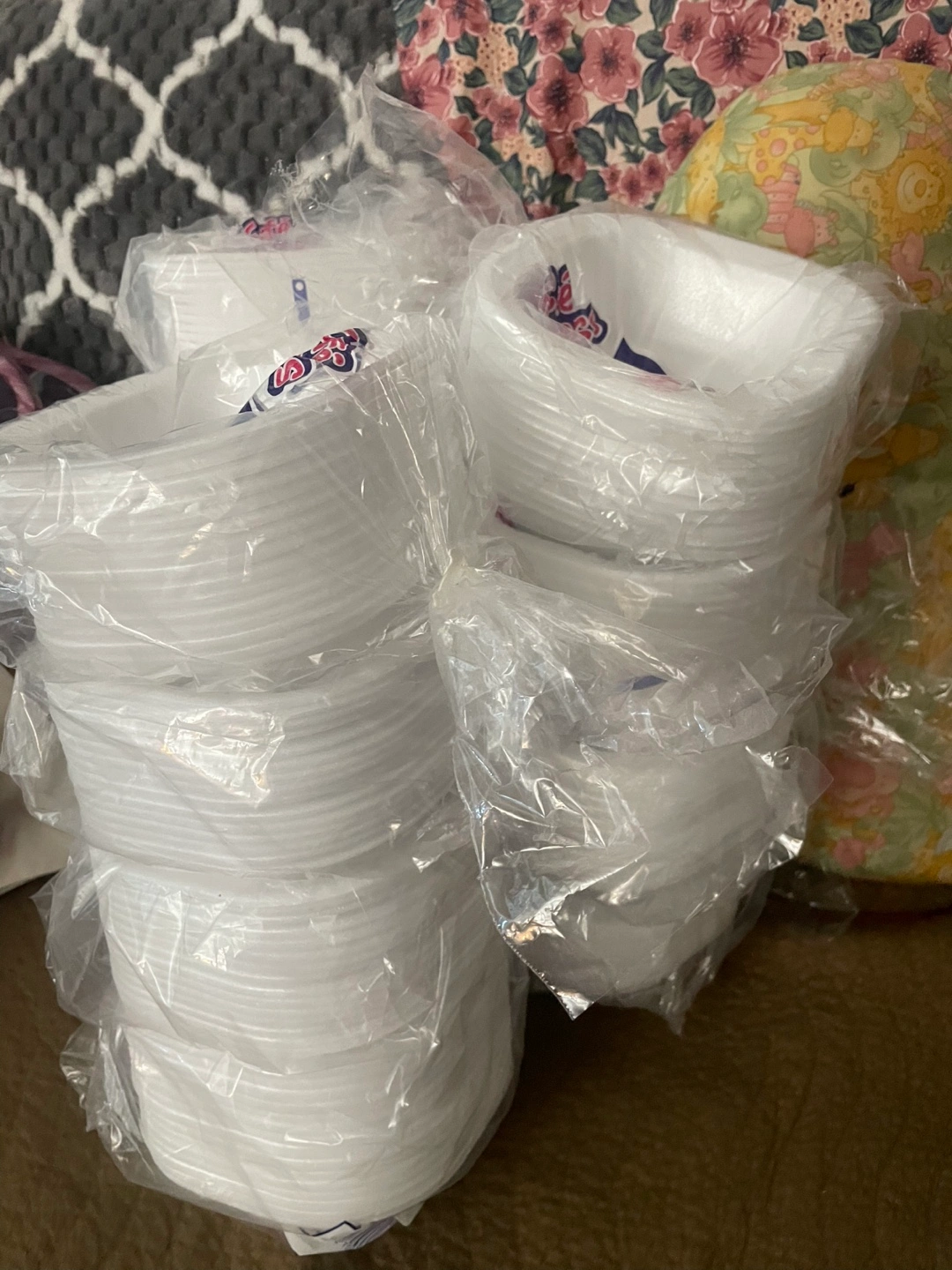 180 pieces white foam bowls. 12 oz capacity. Individually packaged in plastic. Great for parties or events.each bag 15 pieces I have 12 bags $3 each bag pick up Markham and Lawrence