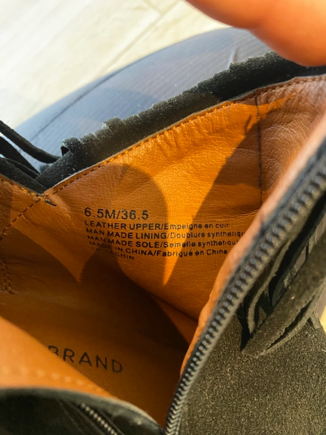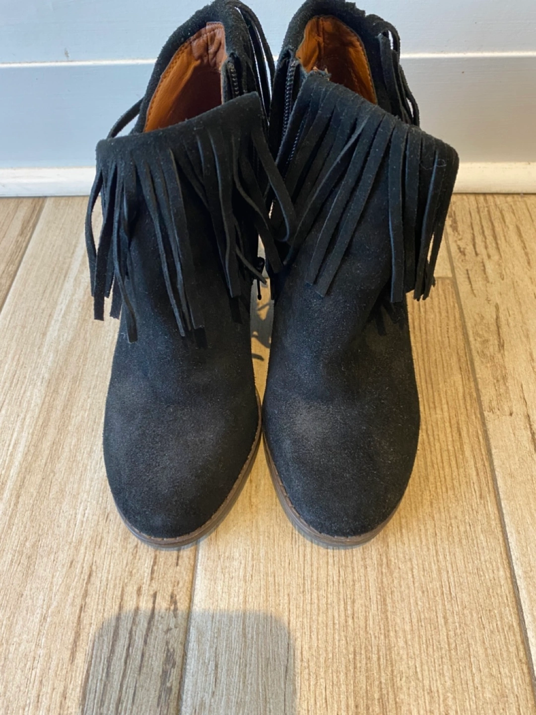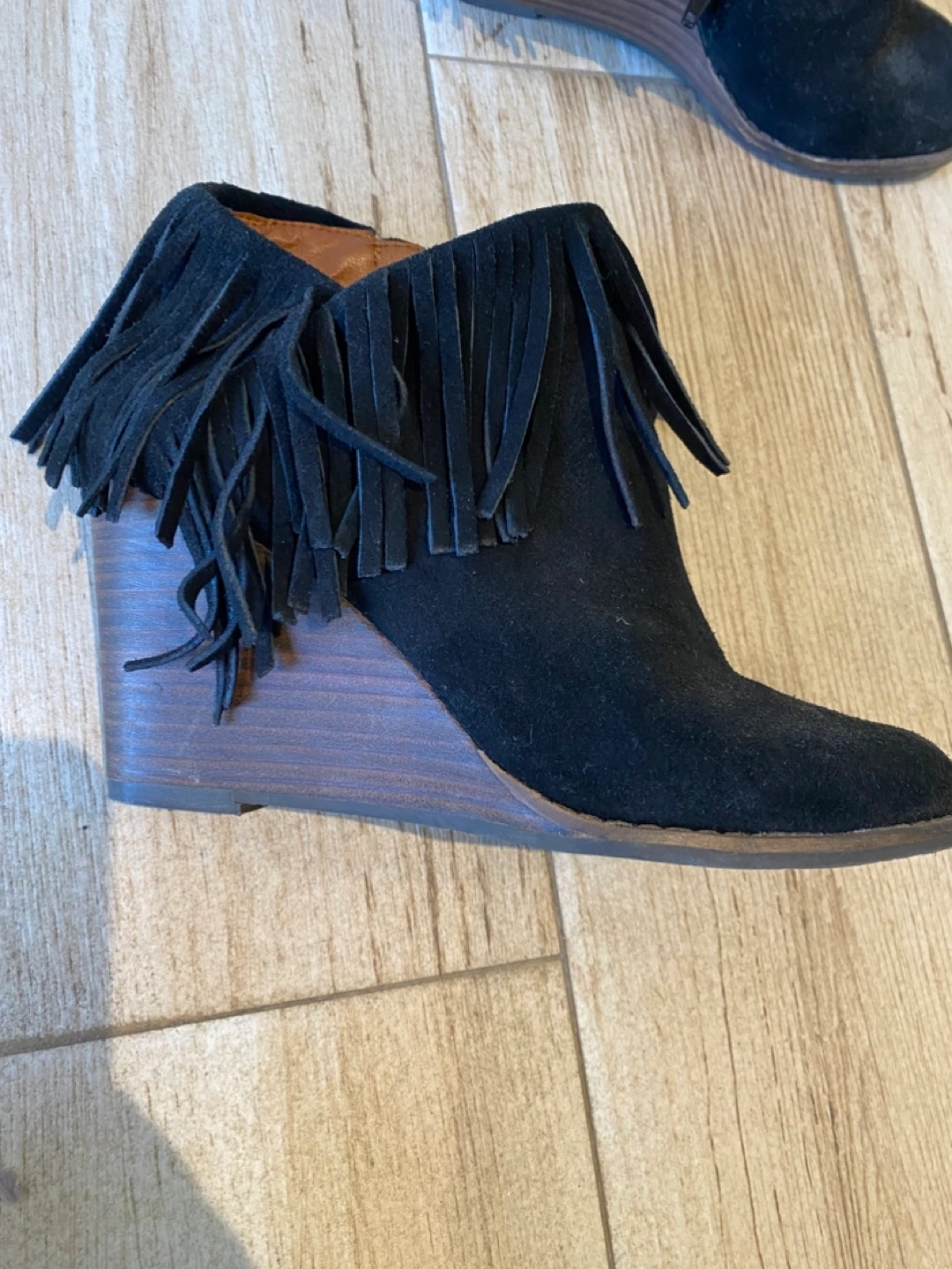 Black suede booties. Wedge heel. Fringe detailing. Size 6.5. Zip closure. Pre-owned.