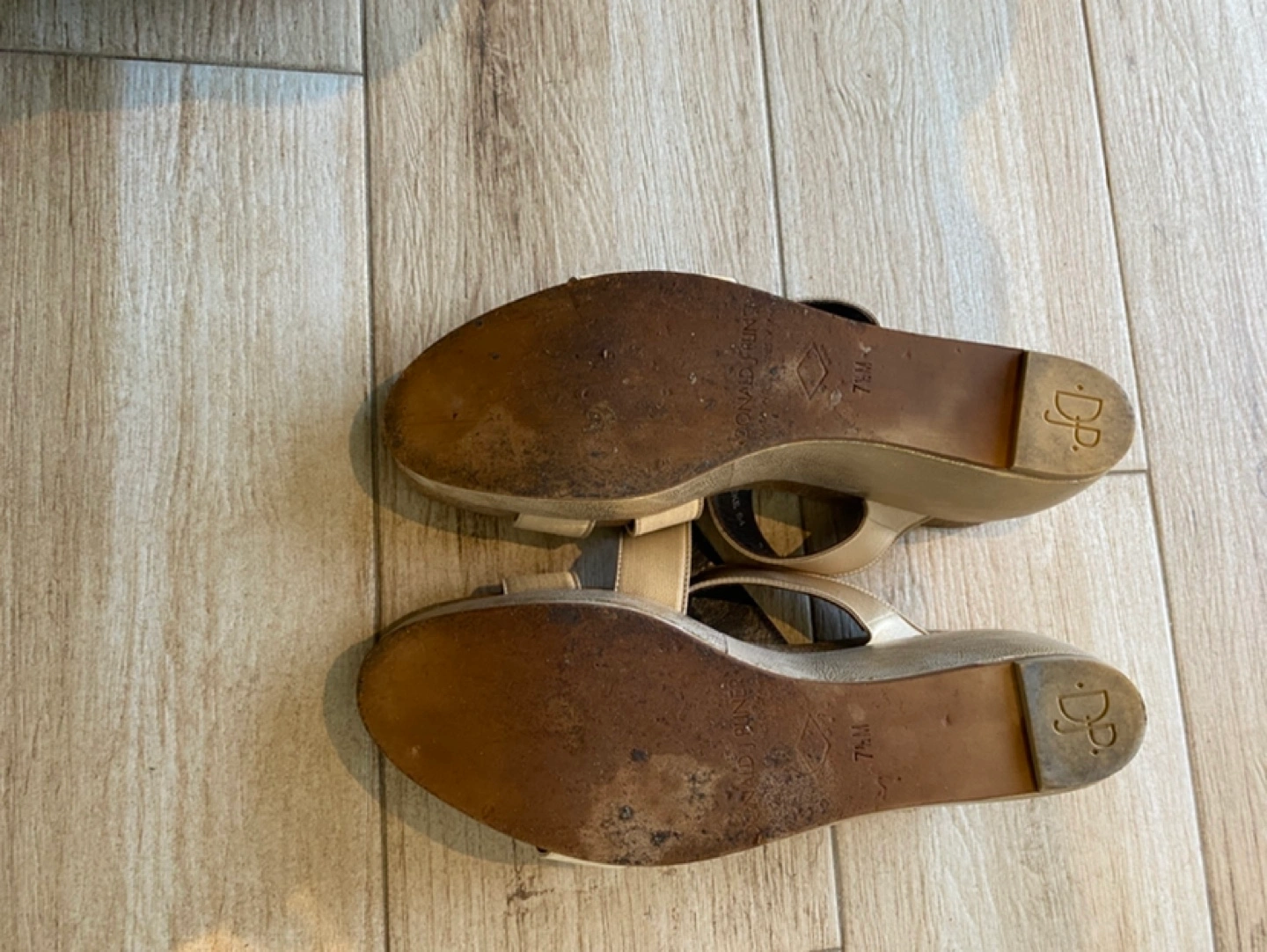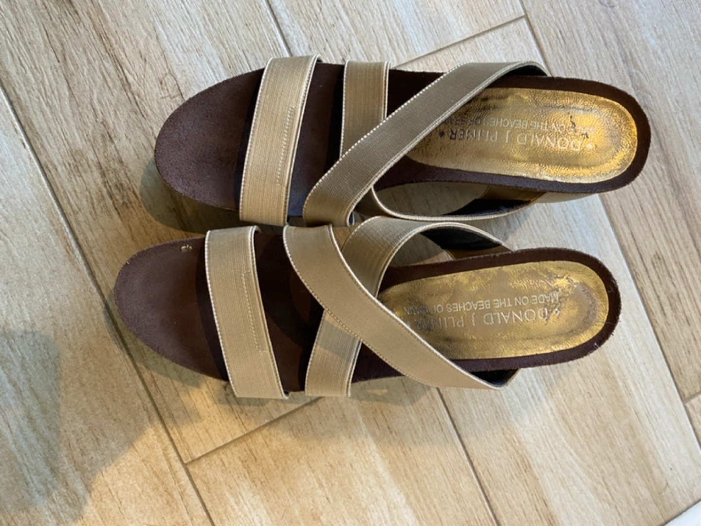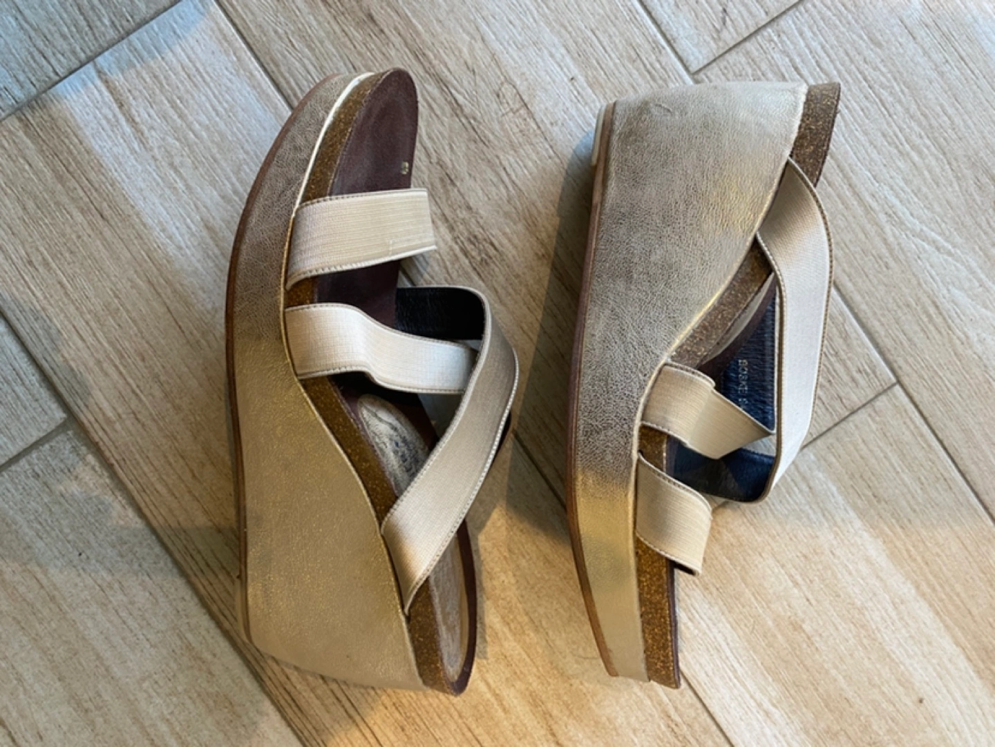 Gold-tone wedge sandals. Size 7.5. Features criss-cross straps. Cork wedge heel. Pre-owned. Please refer to pictures for more details on condition and design.