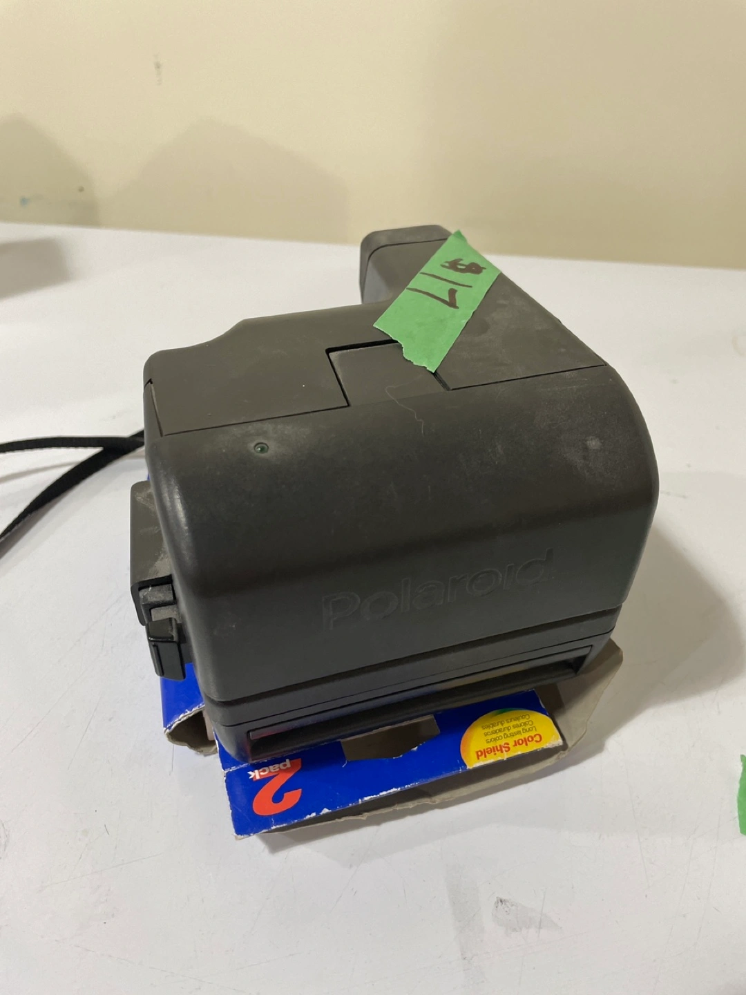 Pre-owned Polaroid 600 instant camera. Includes two packs of Polaroid 600 film. Shows some wear.
