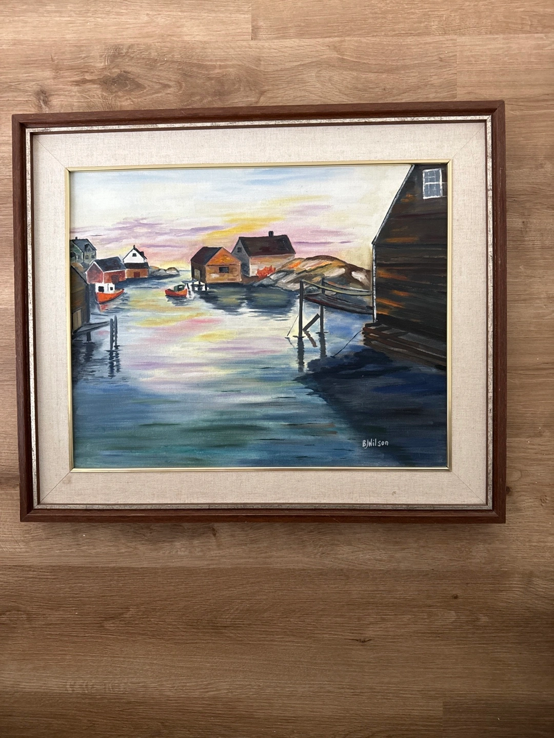 Original artwork, framed. Depicts a harbour scene with several buildings and boats at sunset. Artist's signature visible in bottom right corner.