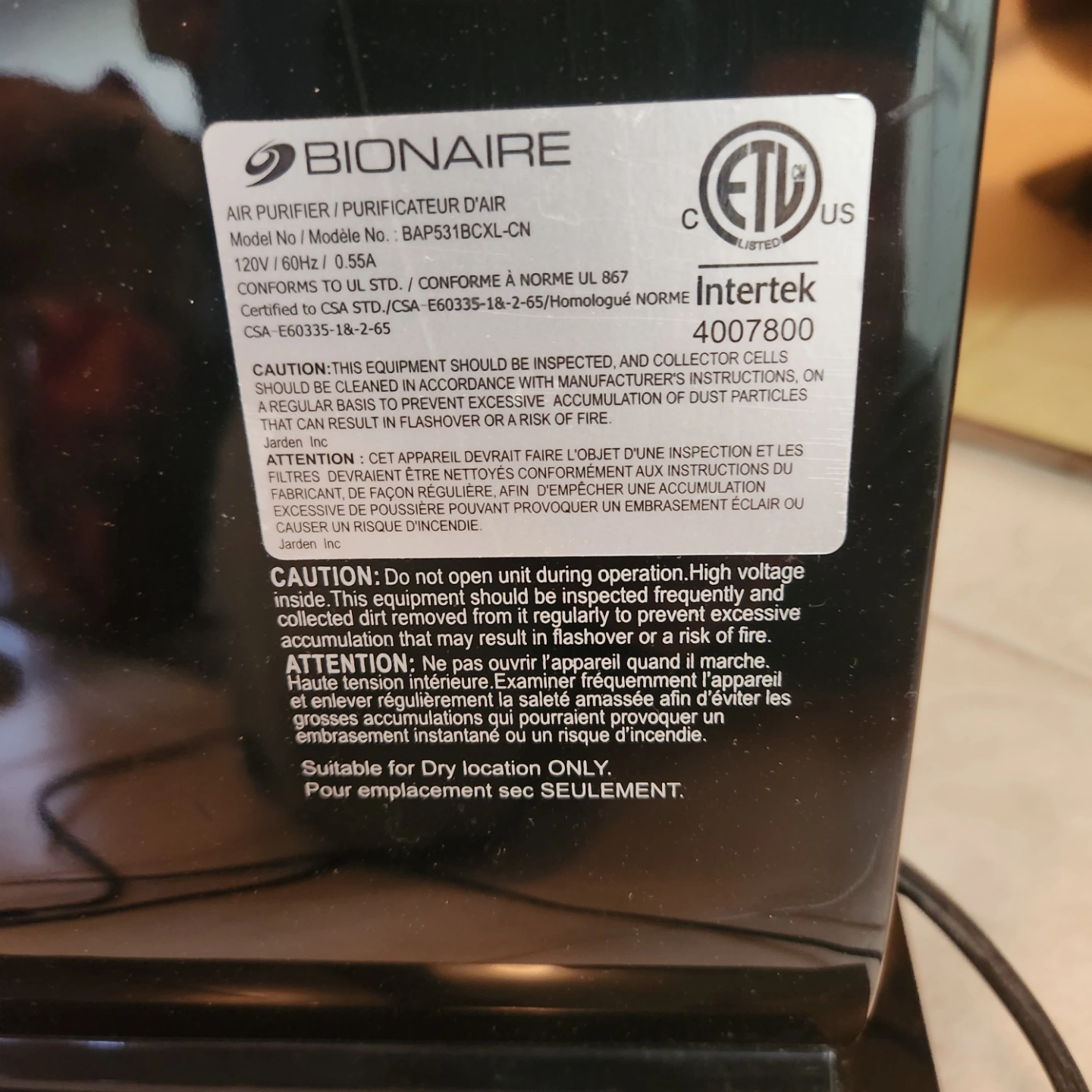 64Black air purifier. Multiple fan speeds and timer settings. Replaceable filters. Model No. BAP931BC-LN. no longer have the instructions. not heavily used.
