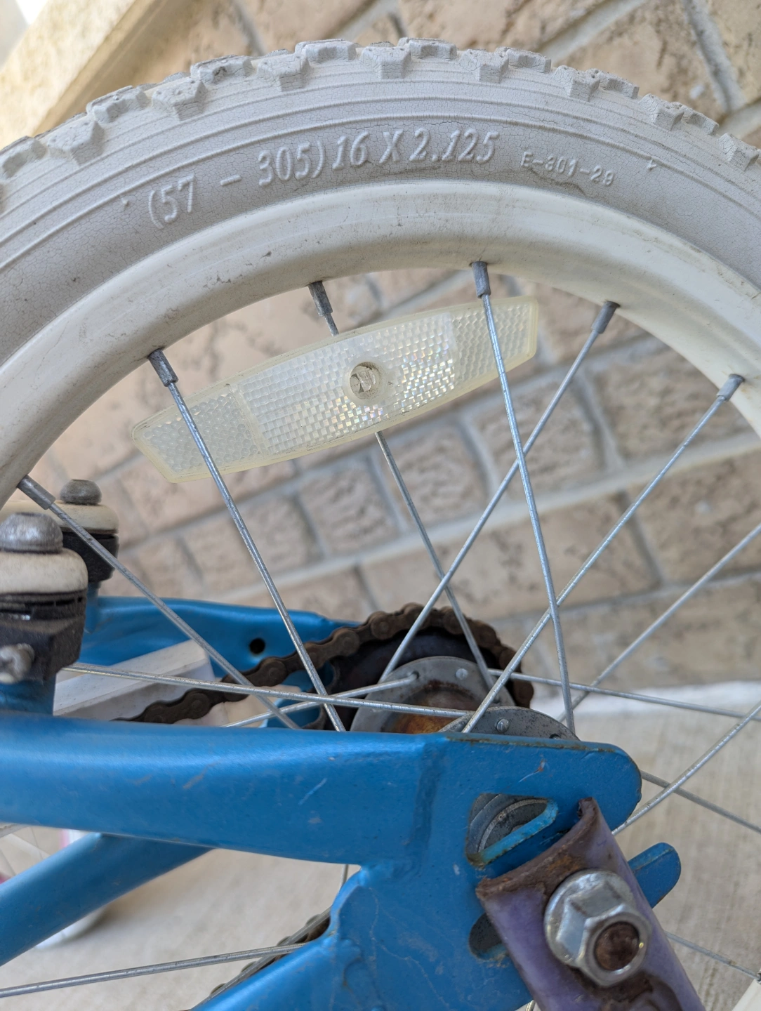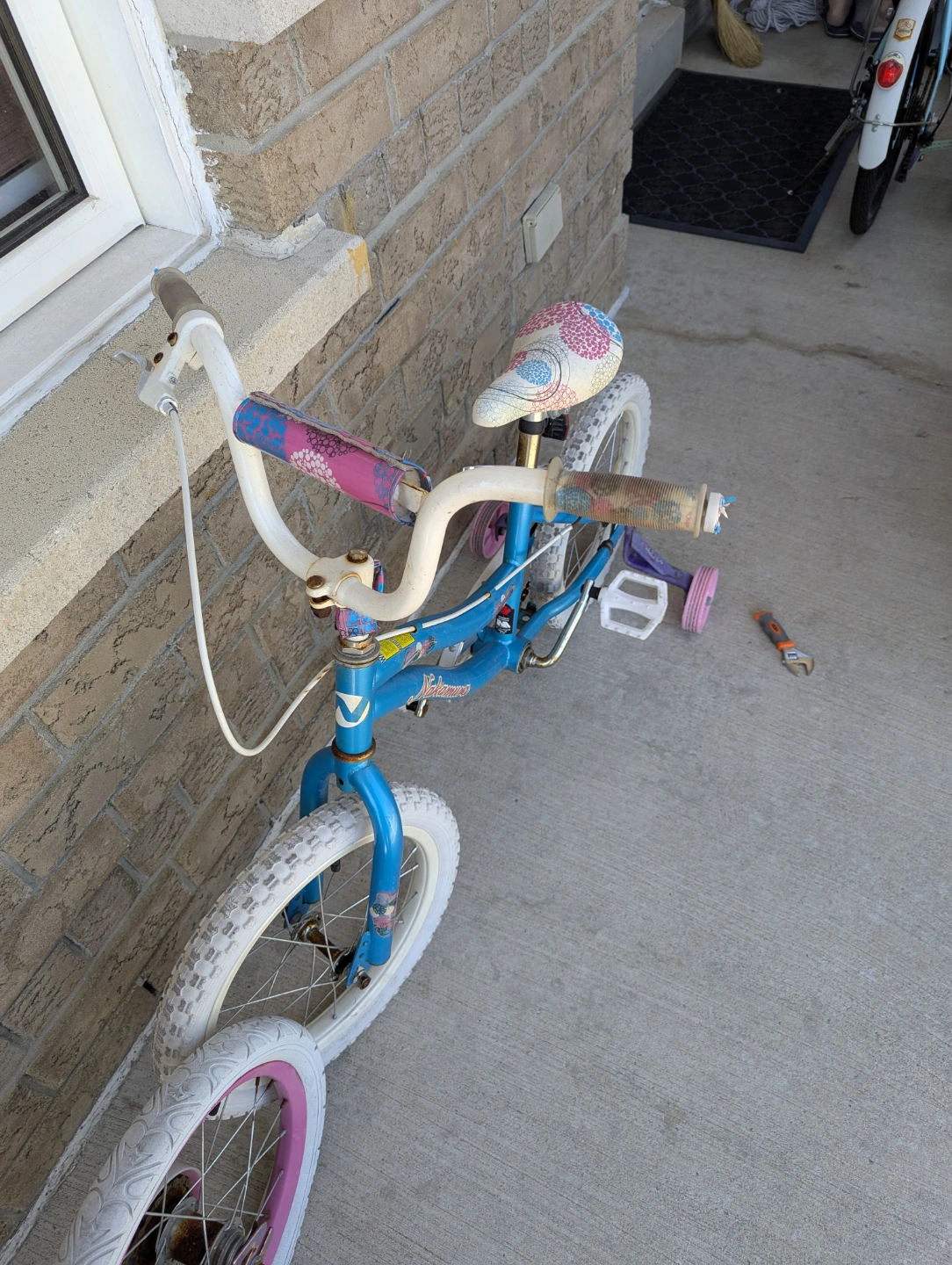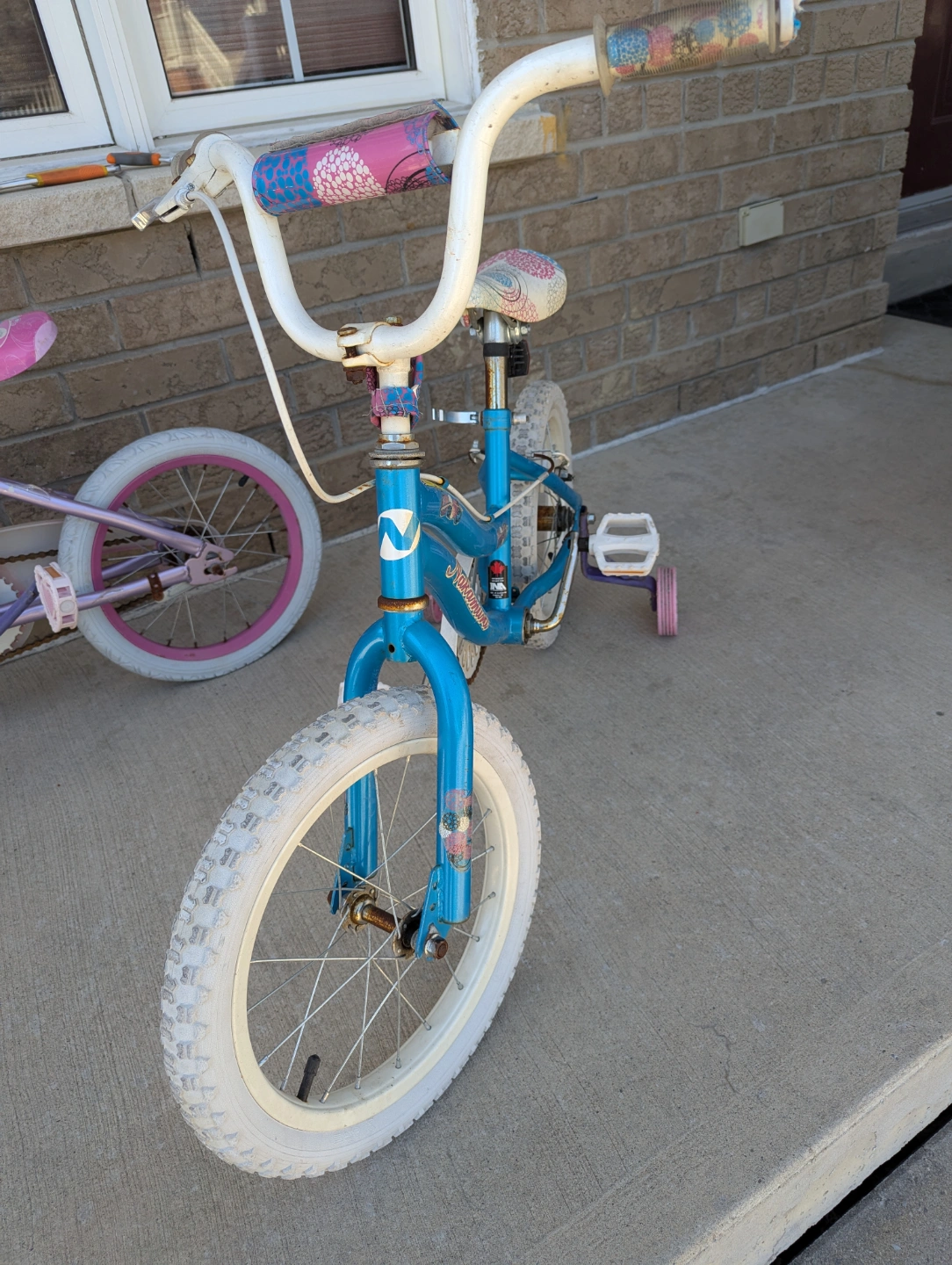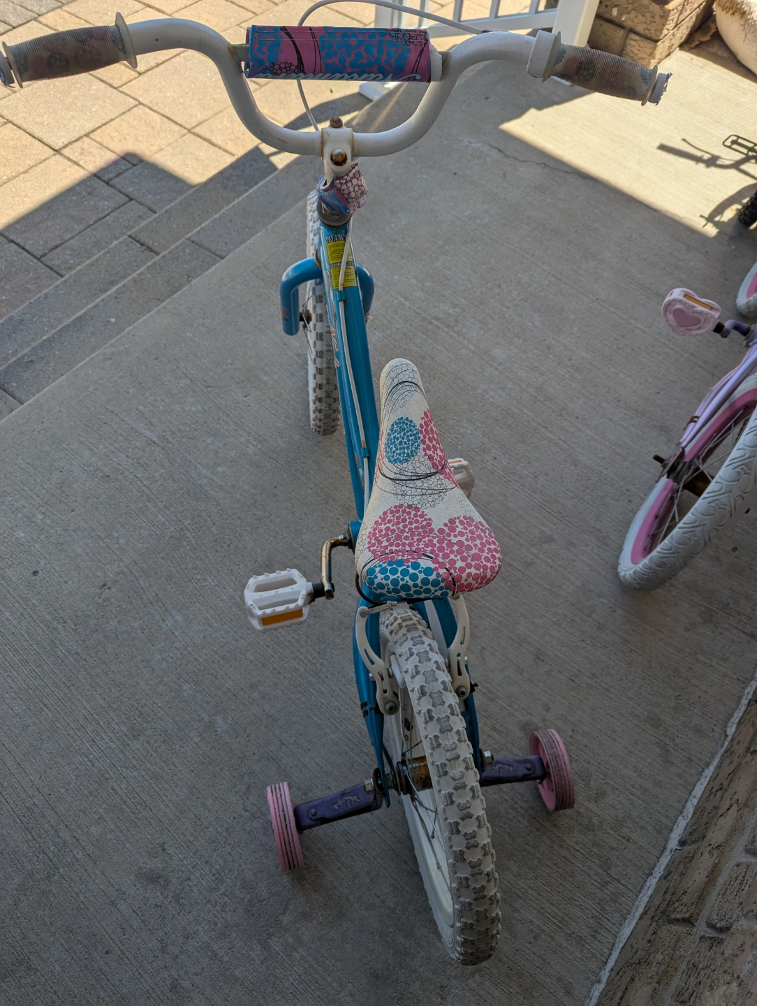 girls' bicycle. Blue frame, white tires, training wheels. 16 inch wheels. Great for younger children.