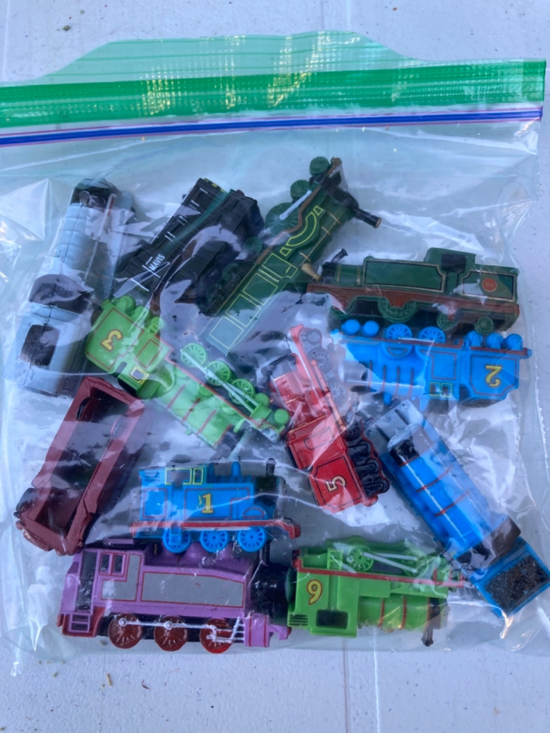 Bag of assorted Thomas the Tank Engine & Friends mini trains. Includes multiple engines and cars. Great for collectors or children.