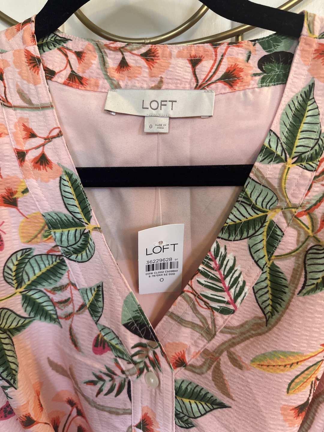 Beautiful pink floral midi dress. Short sleeves, V-neck, button front, and a tie waist. Lightweight and perfect for spring or summer. Size 0. Brand new. Tags still attached. Never worn.