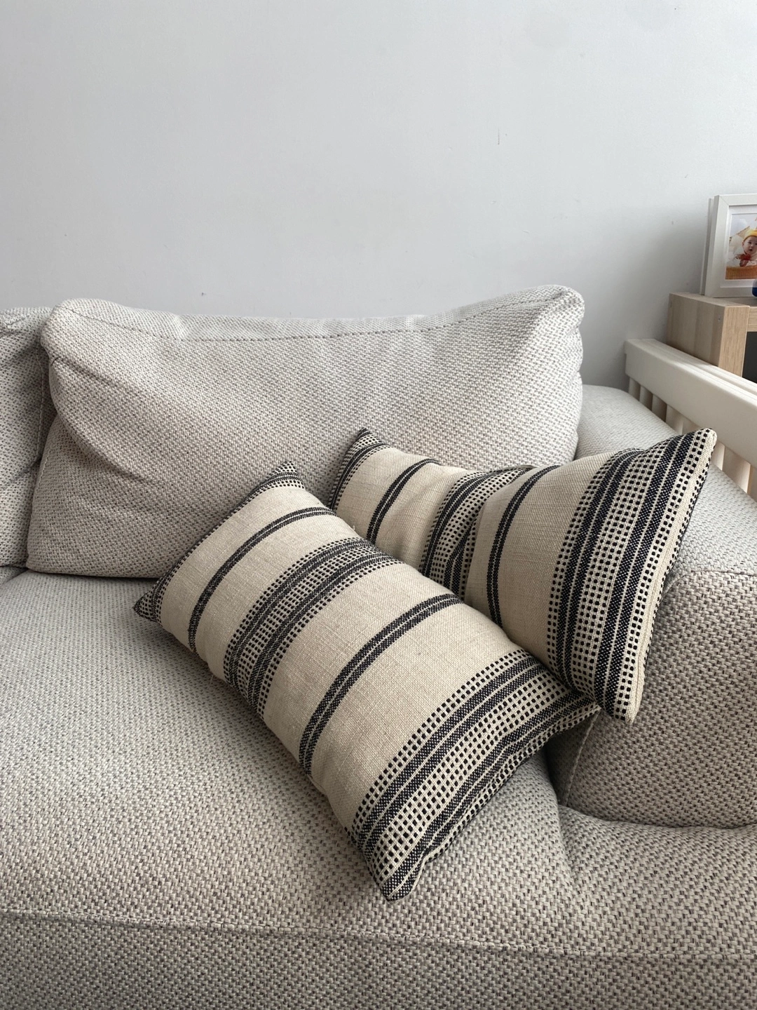 Two decorative throw pillows. Neutral beige and black stripes. Perfect for adding a touch of style to your living room or bedroom.