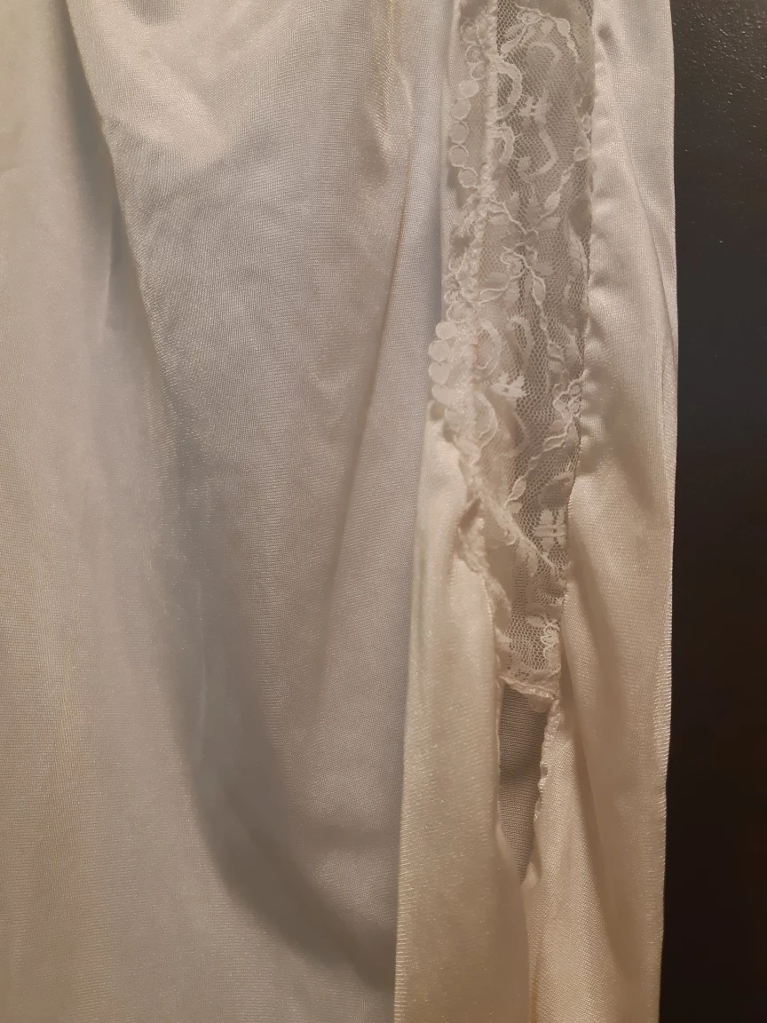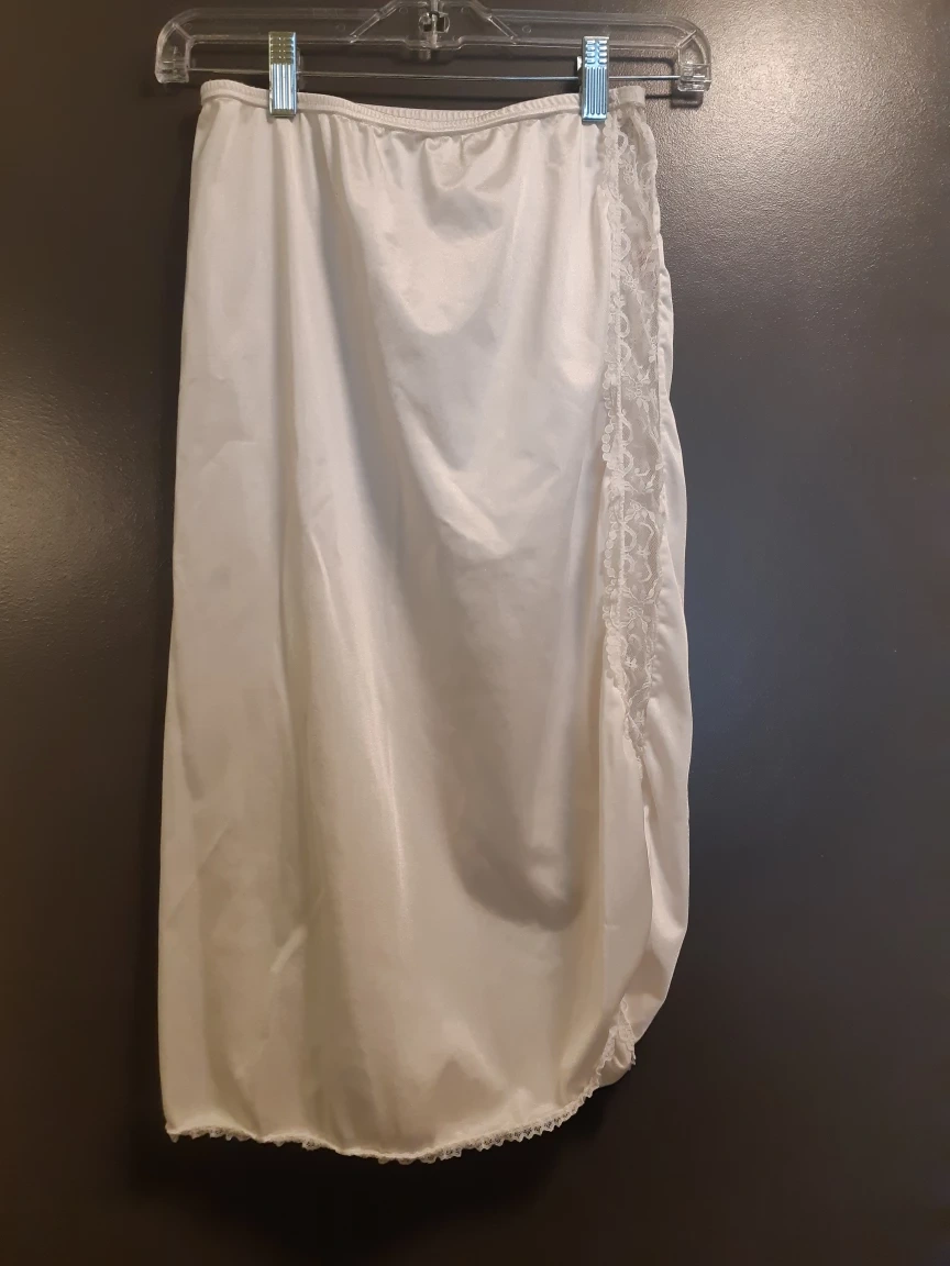 230Vintage-style lace-trimmed slip in white (approximately s/m) with elastic waist for sale for $20 o.b.o.! Good condition! 6043667153 call or text! Greyhound Station/Main St. pick-up is best!