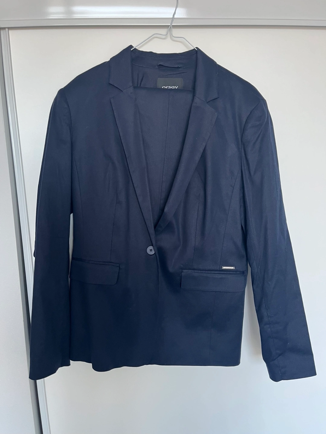 Navy blue women's blazer suit. Single-breasted jacket, long sleeves, and classic fit. Includes matching pants.