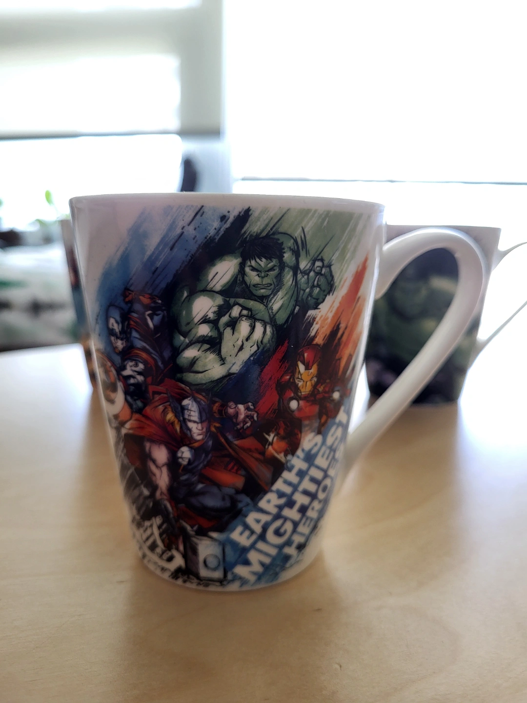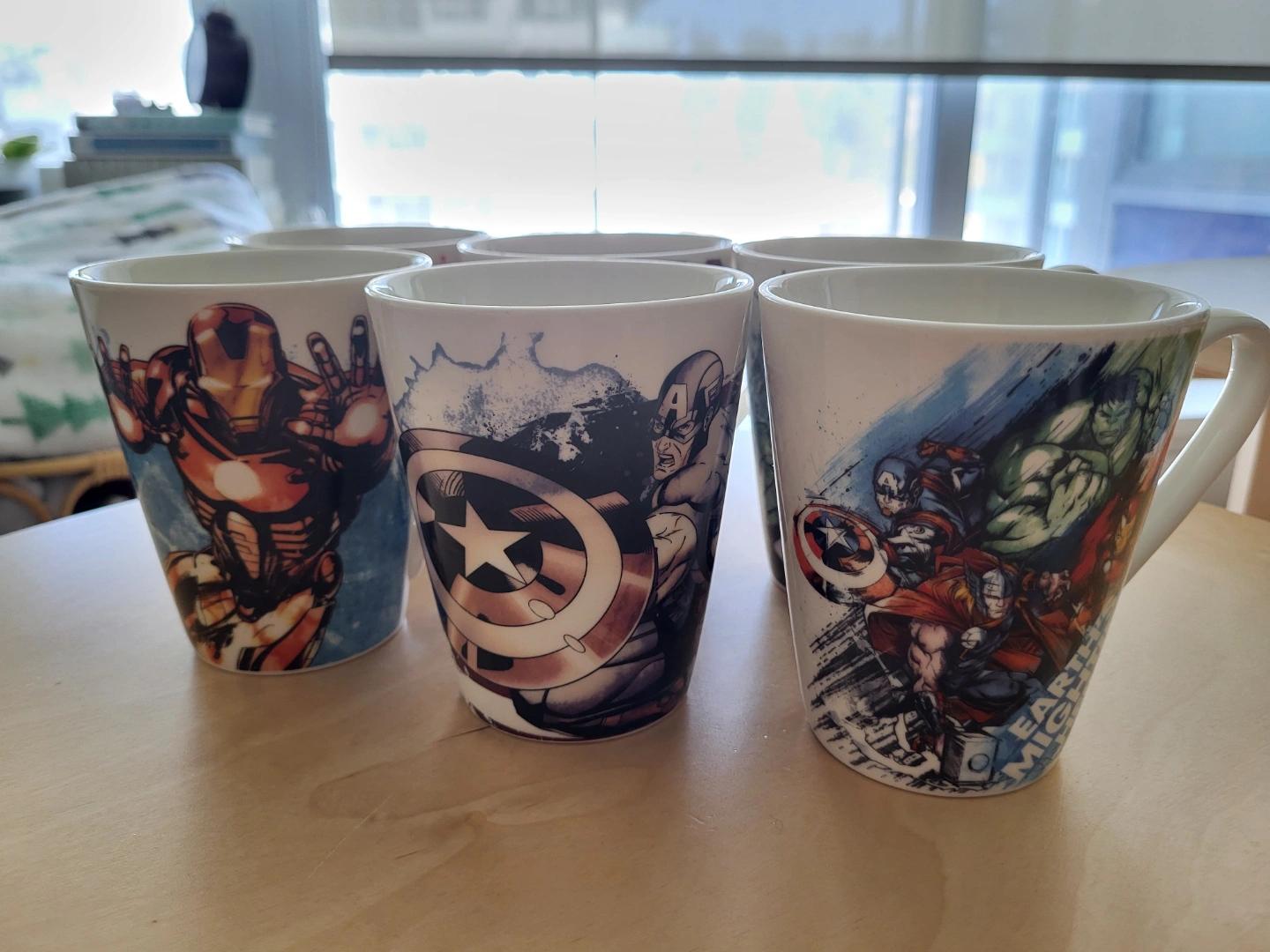 116- Set of 6 Avengers-themed mugs. Features various characters including Hulk, Iron Man, Captain America, Thor and Black Widow. - No chip.