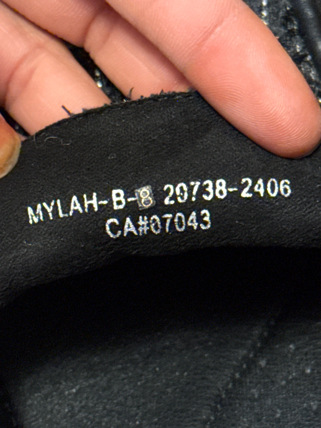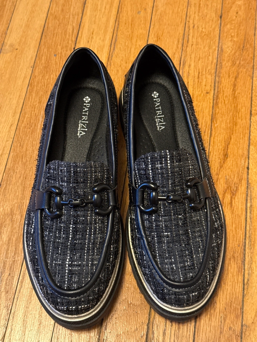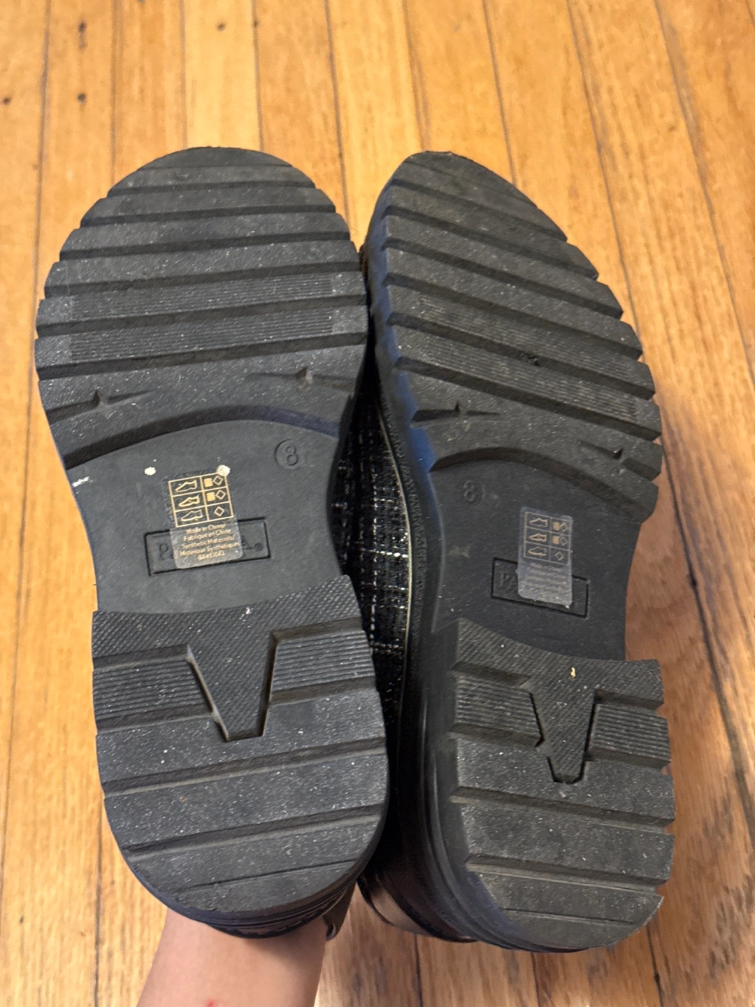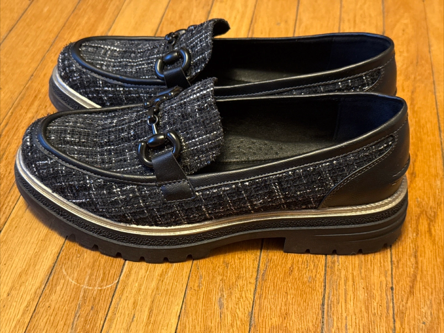 Black and silver tweed loafers. Chunky sole. Metal detail on vamp. Size 8. Made in China.